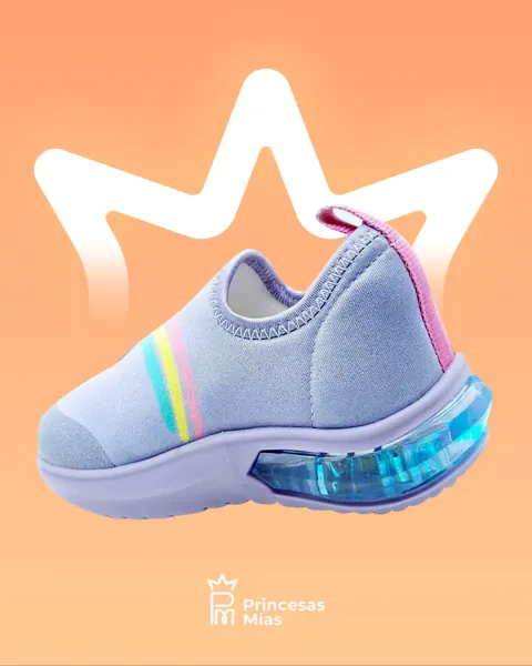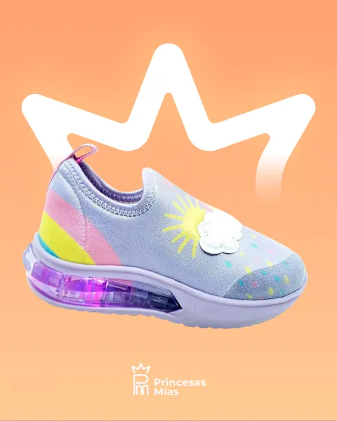 enis infantil con diseño alegre y colorido que representa sol, nube y gotas de lluvia. Suela con luces LED integradas que se activan al caminar. ¡Una experiencia mágica para cada paso! Beneficios: Luces en la suela que brillan con el movimiento. Diseño sin cordones: calce fácil y rápido. Material textil suave y respirable. Plantilla interna anatómica y cómoda. Suela antideslizante y flexible. Materiales: Exterior: textil con acabado glitter. Interior: textil respirable. Suela: goma EVA con luces LED. Colores: Multicolor pastel (lila, rosa, amarillo, celeste).