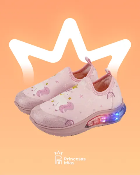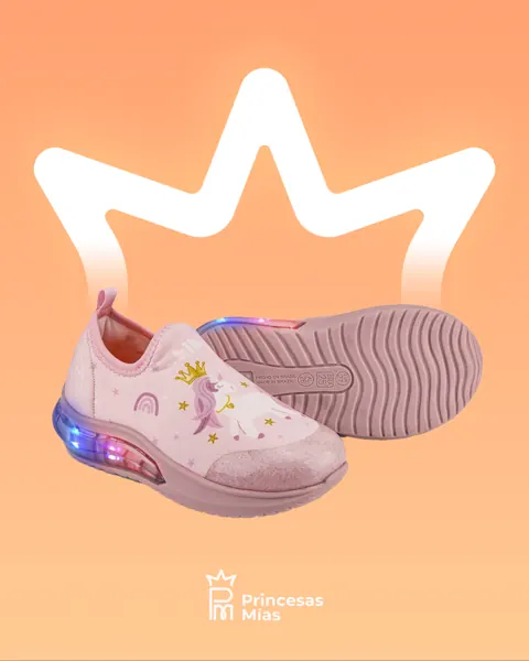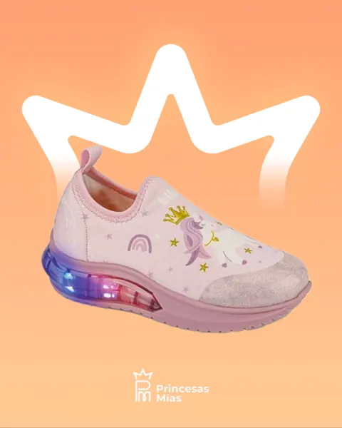 Inspirados en el mundo de los sueños, los Tenis Unicorn Princess de Bibi son ideales para las pequeñas que adoran los cuentos de hadas. Su diseño encantador en tonos rosa pastel con un unicornio coronado, arcoíris y estrellitas los convierte en un calzado lleno de fantasía y ternura. La suela incorpora luces LED que se activan con el movimiento, sumando diversión a cada paso. El calce slip-on sin cordones facilita el uso diario, mientras que su plantilla Fisioflex brinda suavidad y comodidad desde el primer momento. 🦄 Características destacadas: Diseño exclusivo con unicornio, arcoíris y estrellas. Suela con luces LED que se encienden al caminar. Calce anatómico y flexible (slip-on sin cordones) Plantilla Fisioflex antibacteriana Material suave al tacto y lavable. Refuerzo delantero para mayor protección.