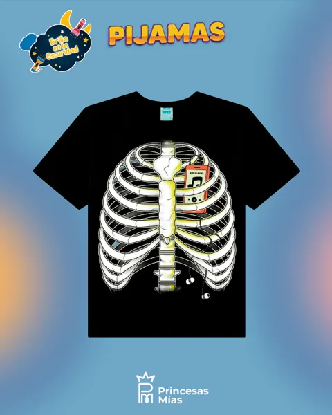 Un conjunto diferente y súper llamativo. Ideal para peques con estilo, perfecto para pijamadas y noches de diversión. Características: Efecto brilla en la oscuridad Remera manga corta + short Diseño original y moderno Cómodo y liviano Cuidados: Lavar del revés, sin blanqueador, secado a la sombra.