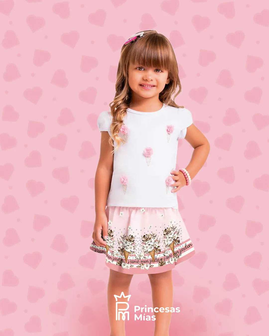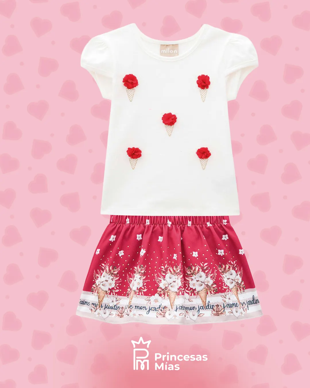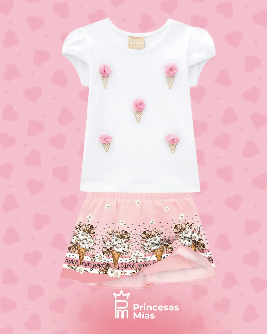 Conjunto de niña de manga corta con falda estampada de la marca Milon. Fabricado en tejido mezcla de algodón y poliéster, proporcionando así una mayor comodidad. Blusa de punto de manga corta con aplicaciones de tul que simulan pequeños conos de helado, muy mona. Una falda con un estampado repetido de ramos de flores sobre conos de helado: ¡qué glamour! Pantalones cortos con forro. Completamente decorado con pedrería. Una gran opción para los días calurosos. Un conjunto del que tu pequeño no podrá prescindir. DATOS ADICIONALES - El paquete contiene: 1 blusa y 1 falda. - Tejido: Algodón y poliéster.