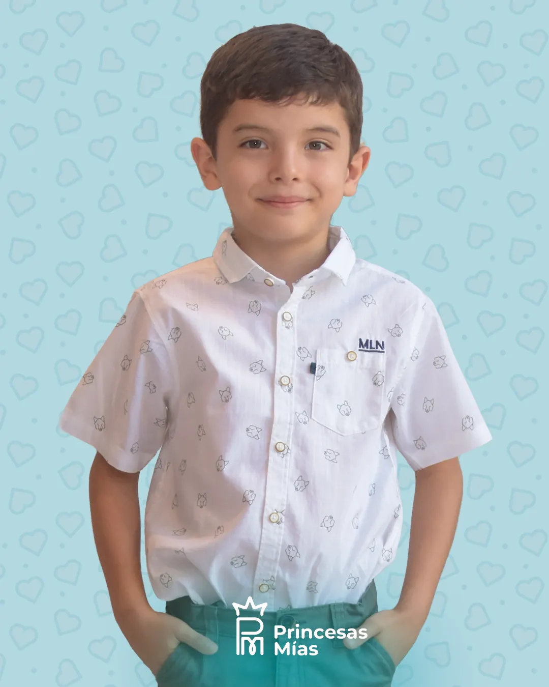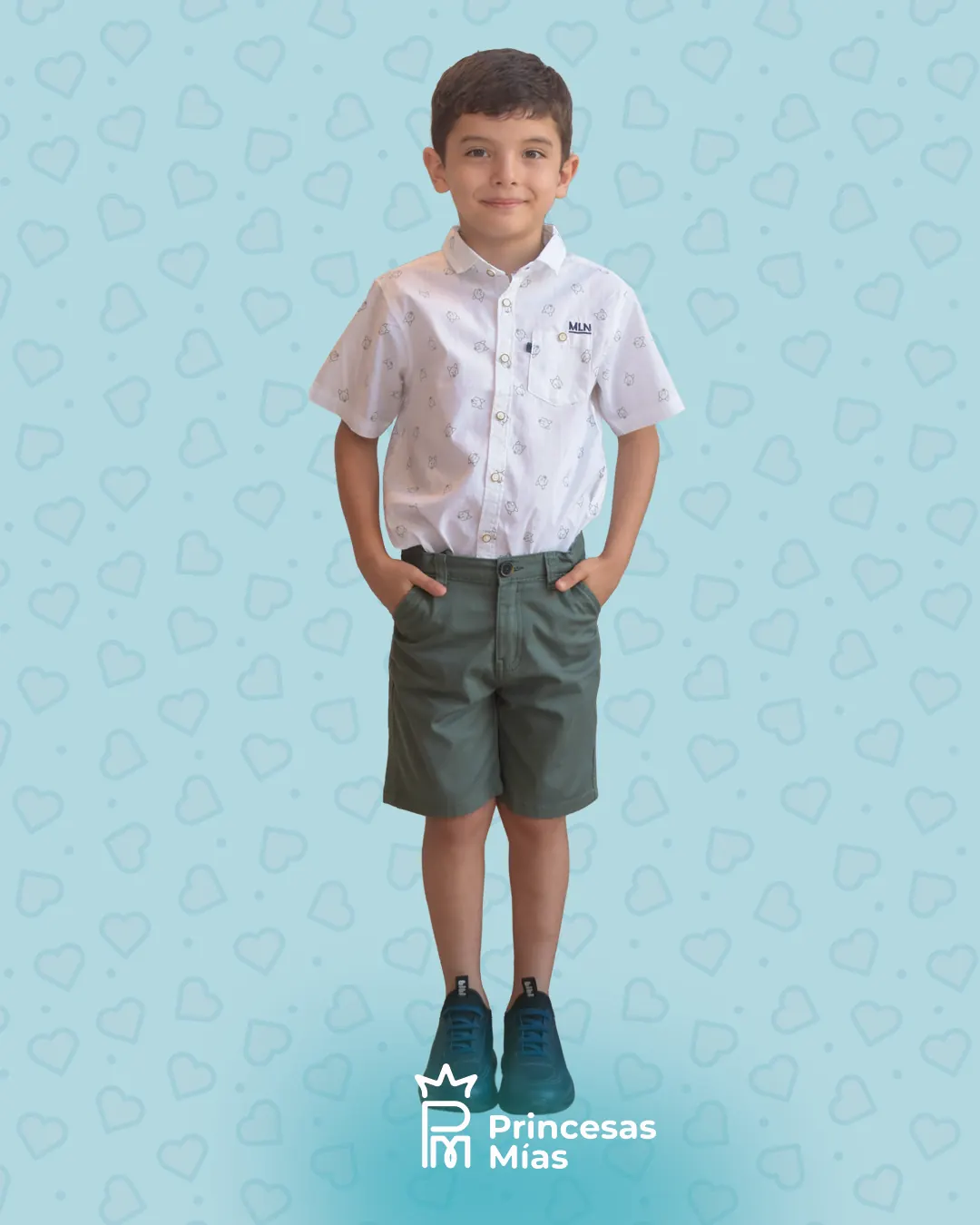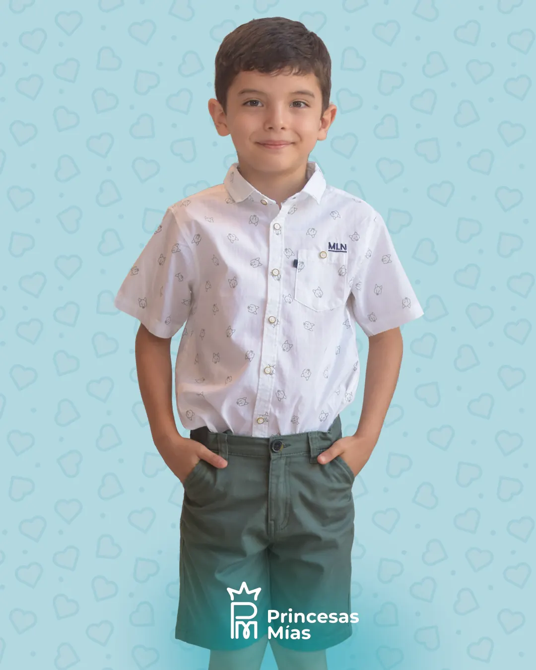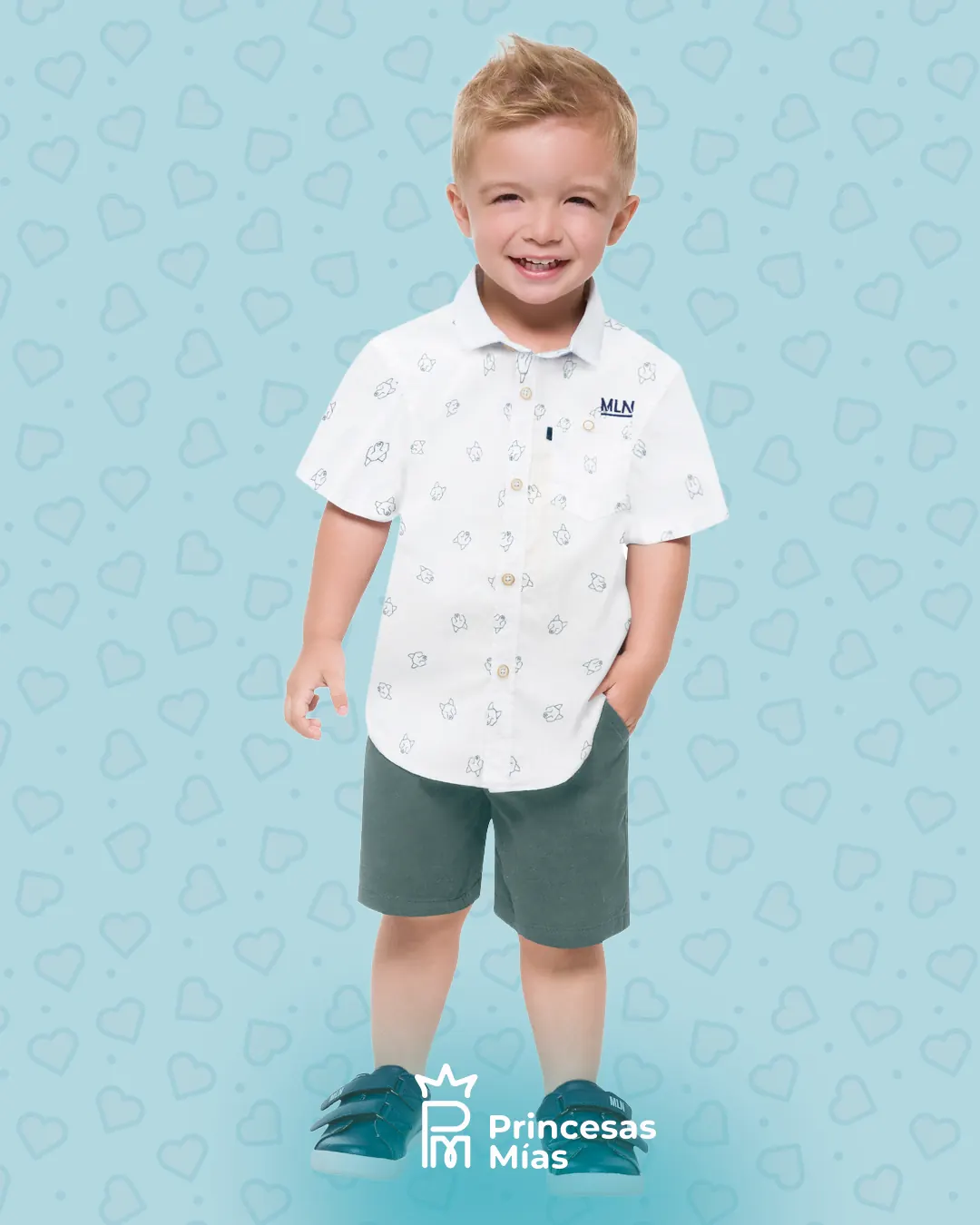 Conjunto camisa y bermuda Milon niño Un look clásico y delicado para los pequeños caballeros de la casa. La camisa manga corta, en tono claro con mini estampados y bolsillo frontal, aporta un aire elegante pero súper cómodo para los días de calor. Se combina con una bermuda tipo chino, de tejido suave y con bolsillos, ideal para moverse y jugar sin perder el estilo. Perfecto para cumpleaños, reuniones familiares o eventos especiales donde tu peque quiera lucir prolijo y encantador. 💙