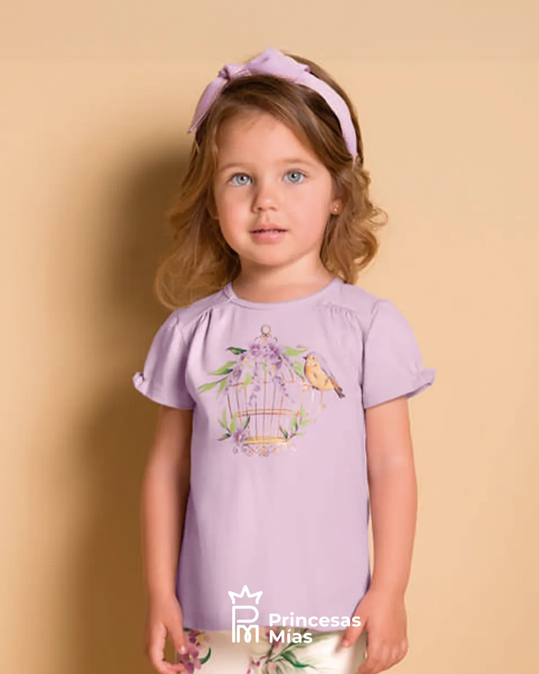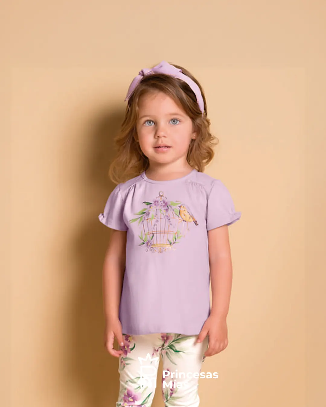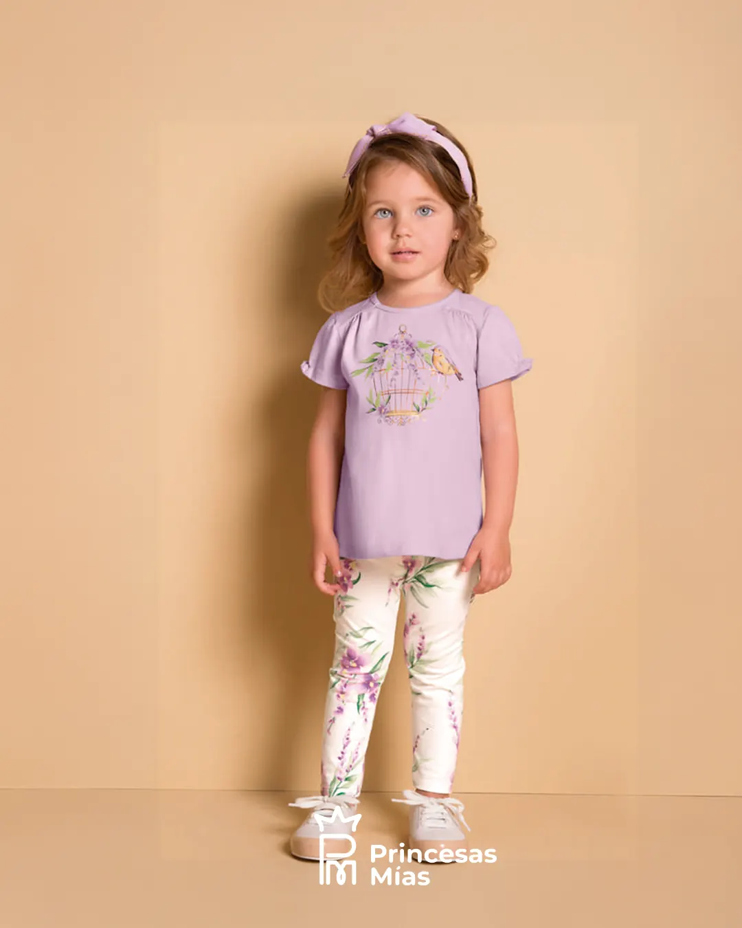 Conjunto súper dulce compuesto por remera lila con estampa de jaulita y pajarito, y calza blanca con flores en tonos violetas. Las manguitas con pequeño volantito aportan un toque romántico, mientras que la calza se ajusta suave al cuerpo para que tu princesa juegue y se mueva con total comodidad. Ideal para paseos, cumpleaños y días de pura ternura.