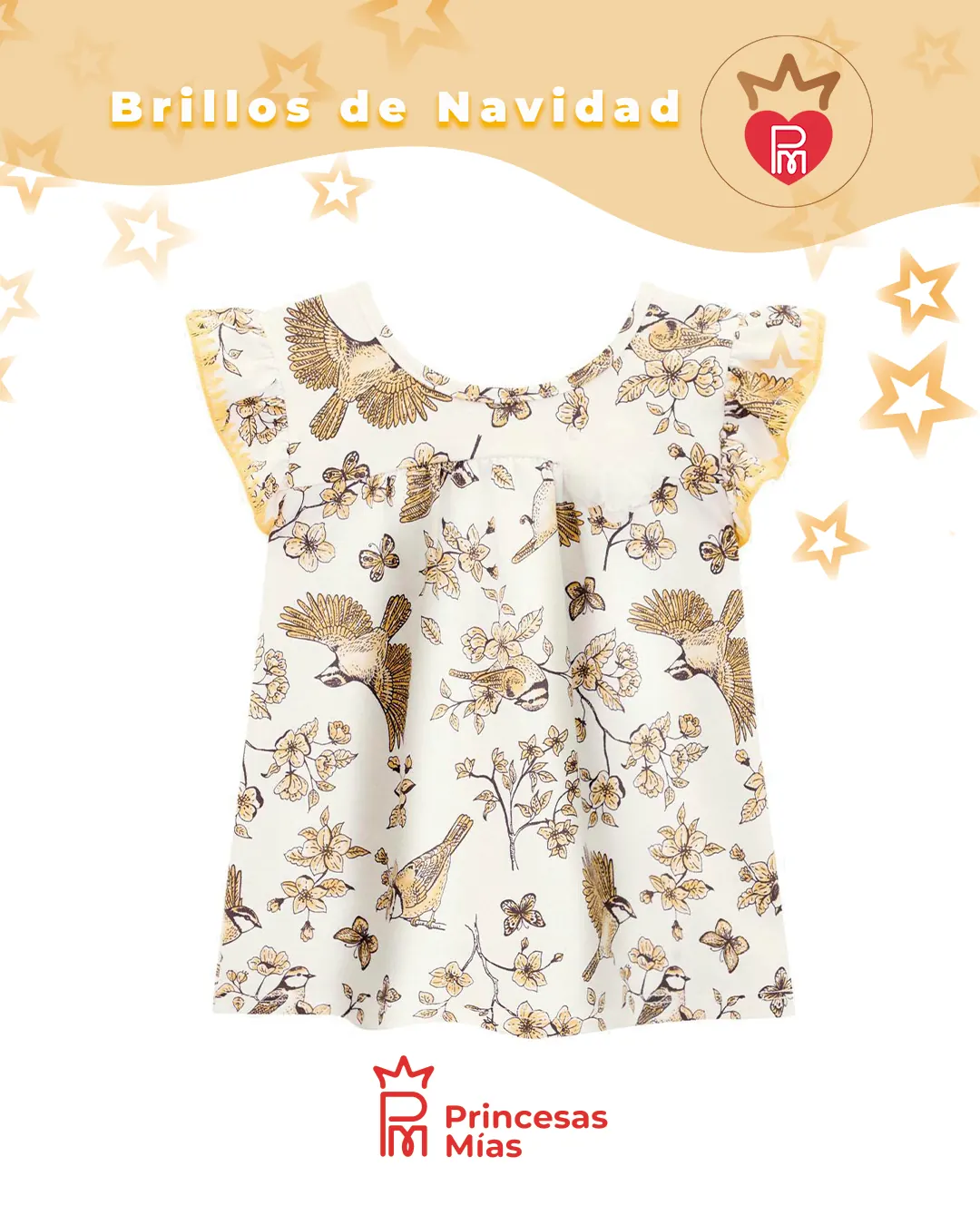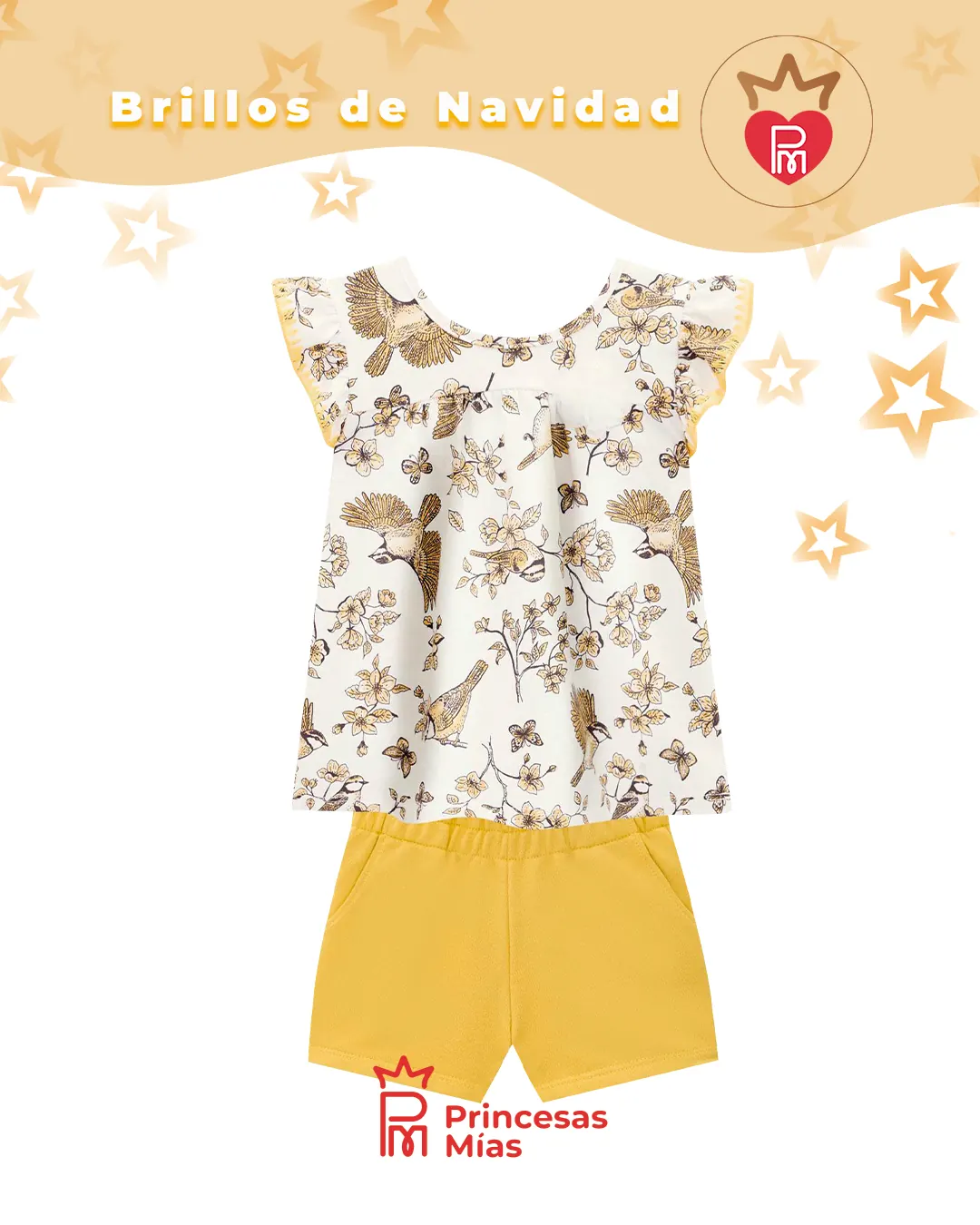 El conjunto Milon para niña consta de una blusa de algodón y pantalones cortos de polar. La blusa presenta un estampado integral, un canesú delantero ligeramente fruncido, una aplicación de flores de gasa y ribetes bordados en las mangas. Los pantalones cortos tienen bolsillos delanteros y una cómoda cinturilla elástica. Algodon 100%