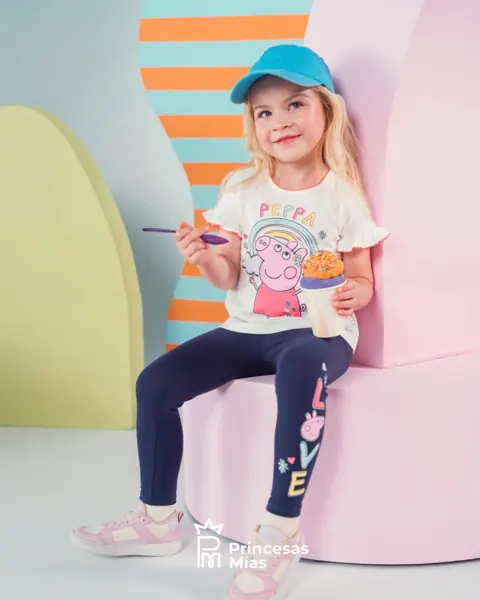 n conjunto encantador para las pequeñas fans de Peppa Pig. Su diseño alegre, colorido y funcional lo convierte en la elección perfecta para el día a día, salidas especiales o momentos de juego. 👕 Remera blanca con voladitos: Estampado frontal de Peppa Pig bajo un arcoíris, rodeada de nubes y corazones. Mangas con volados y pespunte rosa, detalles delicados que marcan la diferencia. Cuello redondo con terminación festoneada. 👖 Legging azul marino: Confeccionado en tejido suave y elástico para total libertad de movimiento. Estampado lateral con la palabra "LOVE" y detalles de Peppa y flores. 🌟 Composición: 100% algodón (remera) | 95% algodón, 5% elastano (legging) 🎨 Colores: Blanco (remera) y azul marino (legging) con detalles multicolores.
