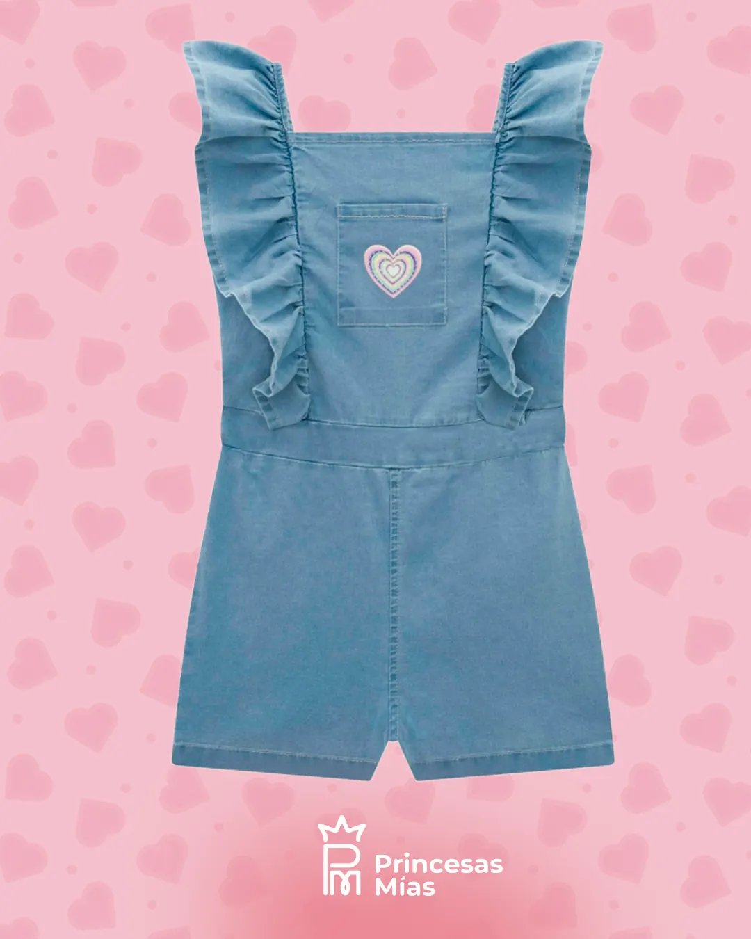 Enterizo de jeans suave con elastano, perfecto para las pequeñas que aman verse lindas y sentirse cómodas. 💙 Tiene breteles con volados que enmarcan el pechito, short amplio para moverse y jugar sin límites y un bolsillo frontal con bordado de corazoncito multicolor que aporta un toque dulce y divertido. El denim liviano y elasticado se adapta al cuerpo sin apretar, ideal para usar todo el día en días de paseo, cumpleaños o salida en familia. Detalles que encantan: Tejido de jean liviano con elastano, suave al tacto. Breteles con volados y bolsillito frontal. Bordado de corazón arcoíris que le da el toque mágico al look.