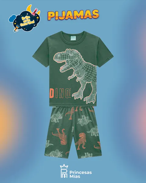 Pijama “Dino” con diseño tipo wireframe (efecto dibujo 3D) en remera verde, combinado con short estampado de dinosaurios. Un set distinto, canchero y comodísimo para dormir y descansar. Detalles: Incluye: remera + short Diseño Dino tipo “malla/3D” + short con dinos Cintura elastizada Brilla en la oscuridad (detalle glow) Fresquito y liviano