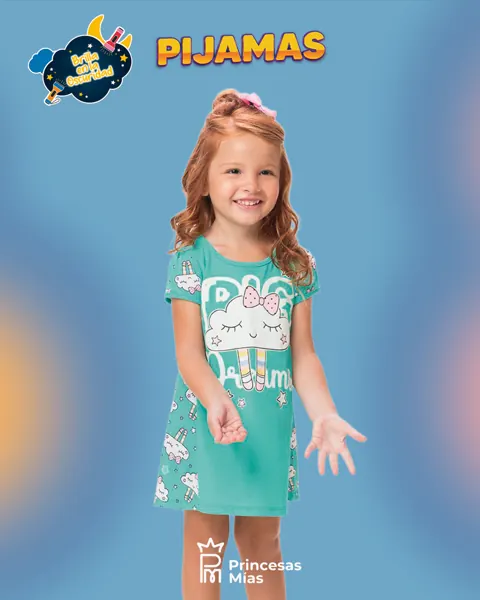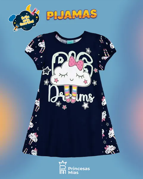 El camisón infantil Kyly está confeccionado en punto jersey con corte trapezoidal. Luce un estampado integral de pequeños elementos y un diseño de nubes en la parte delantera con contornos que brillan en la oscuridad. El pijama Kyly no solo es bonito, sino también divertido, perfecto para dormir.