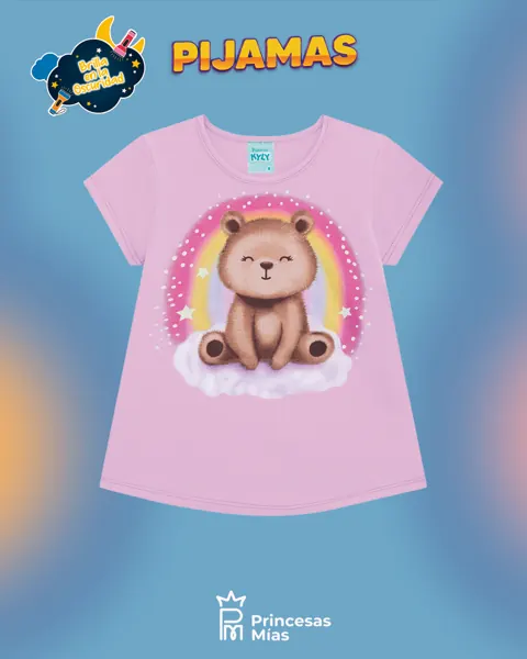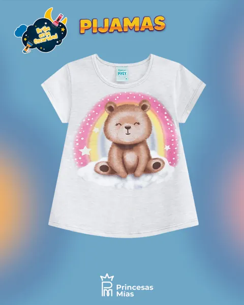 Osita, arcoíris y ternura total. Pijama fresquito con estampa central y short estampado. Brilla en la oscuridad para noches mágicas. Detalles: 2 piezas: remera + short Estampa Osita + arcoíris Brilla en la oscuridad Cintura elástica