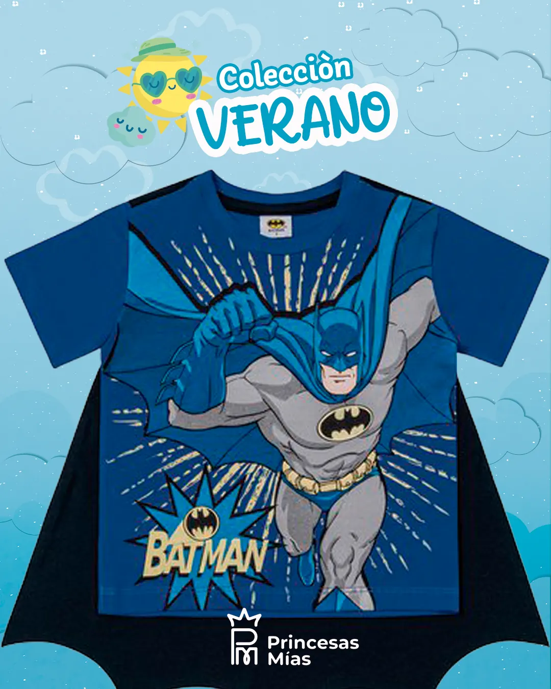 Remera infantil Batman con capa incluida 🦇✨ Para los peques que aman los superhéroes, esta remera trae al Caballero de la Noche listo para la acción y una capa que vuela con cada movimiento. Tela suave y fresca para el verano, ideal para jugar, correr y salvar Ciudad Gótica desde el patio de casa. 💙
