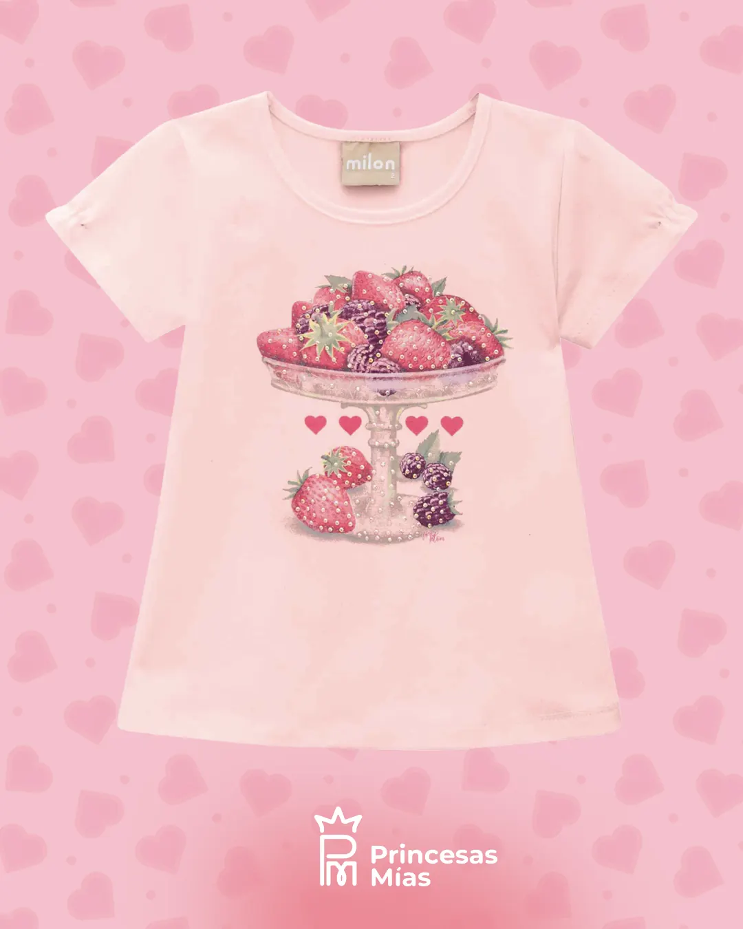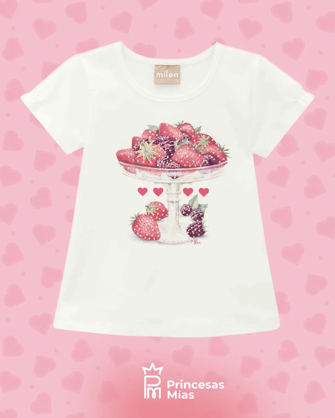 Blusa para Niña Milon confeccionada en Algodón, presenta un diseño clásico, estampado frontal con pedrería y ligero fruncido en las mangas. Composición: 95% Algodón + 5% Elastano