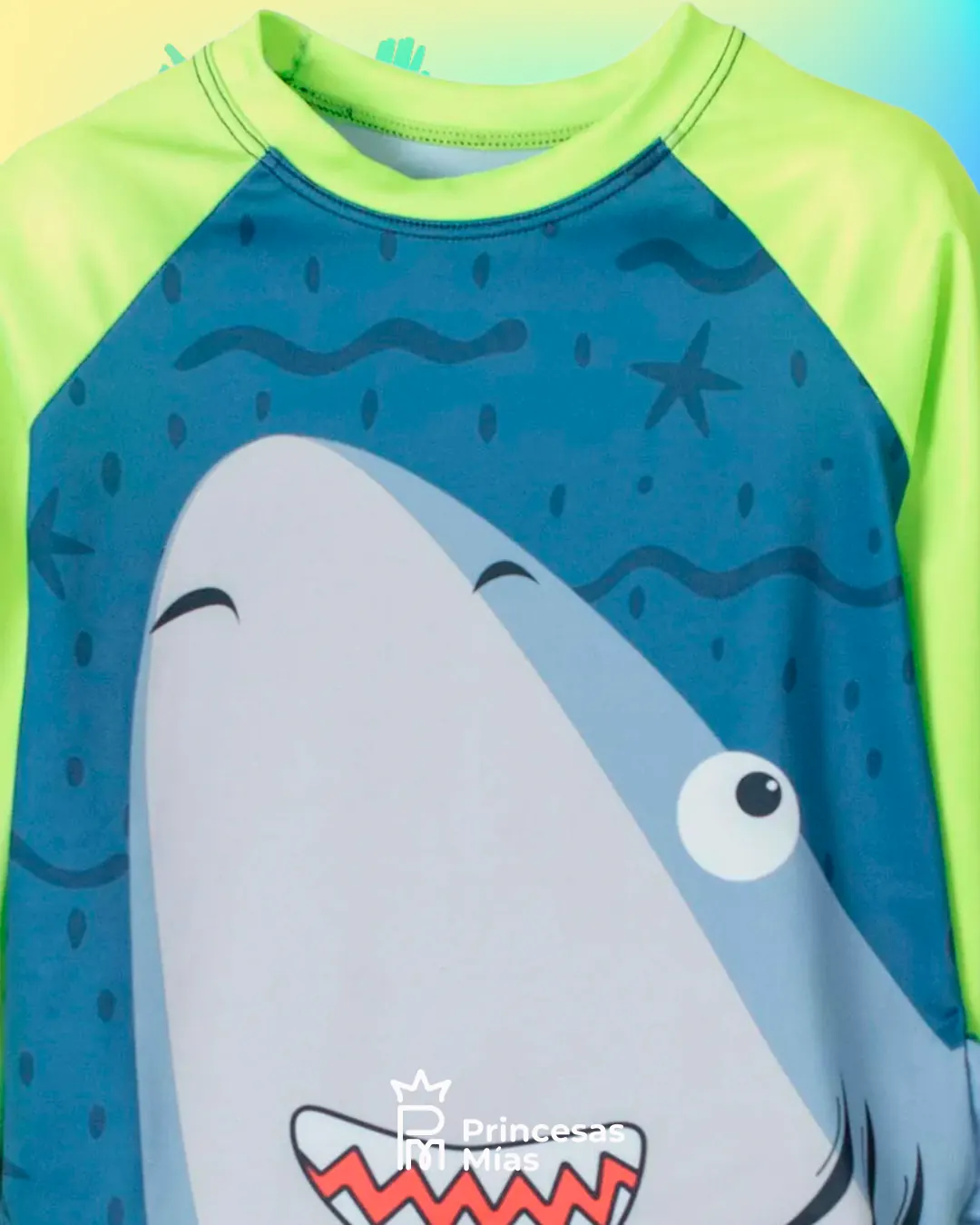 ¡Cómodo y con estilo! Conjunto de baño con camiseta manga larga que permitirá mayor diversión y protección del sol. Su bóxer con estampado de tiburones y la camiseta con una aleta en la parte posterior hará que se sienta seguro y como un pez en el agua. Nadar nunca fue tan divertido. Composición 87% Poliéster 13% Elastano Forro 90% Poliéster 10% Elastano