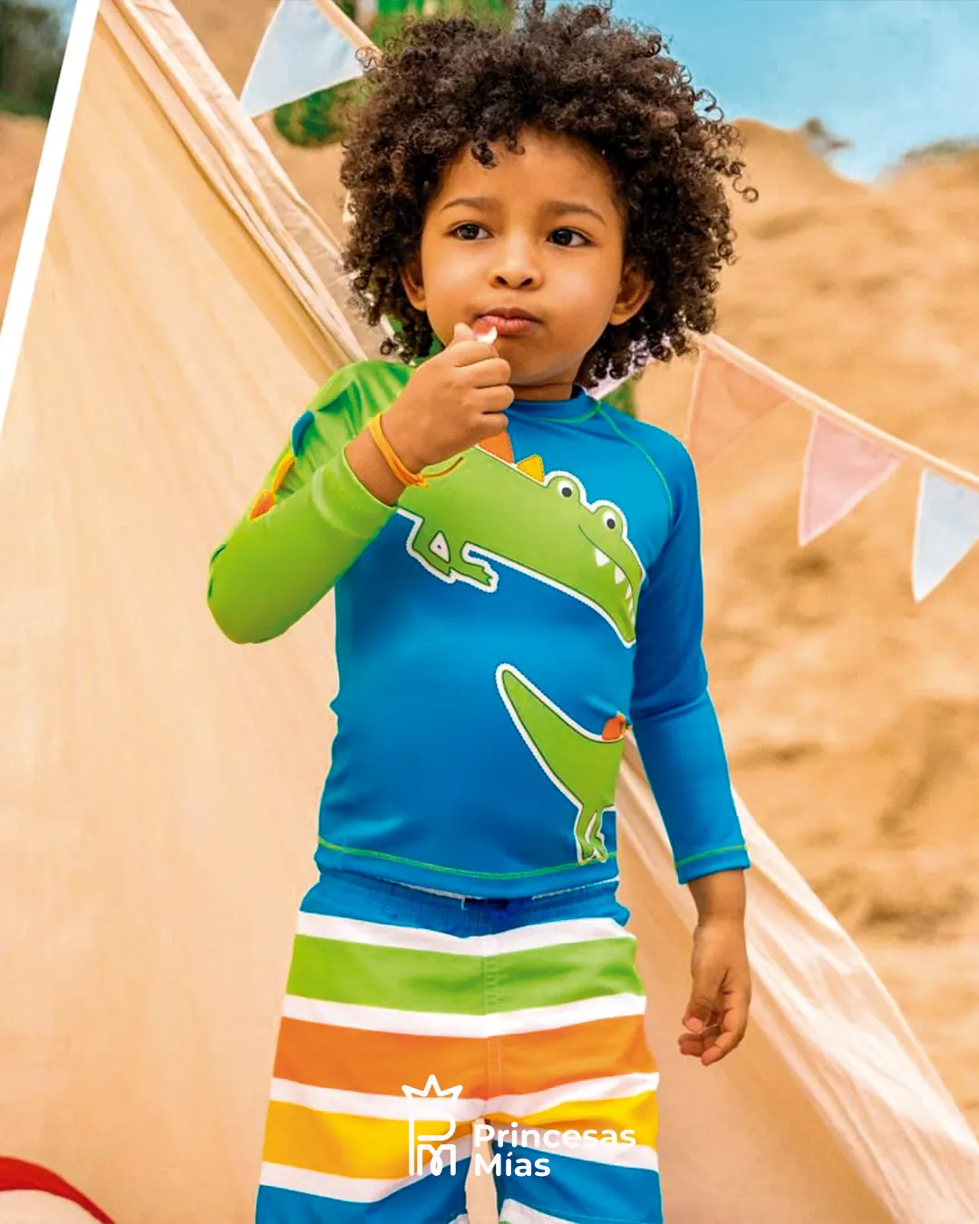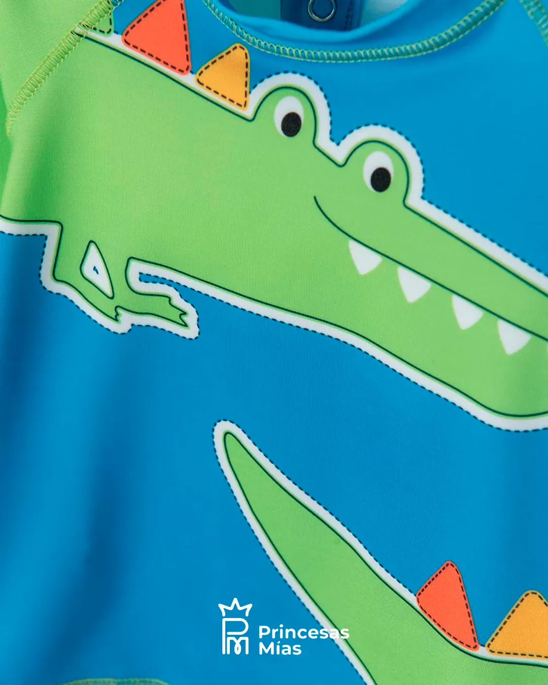 ¡Diversión al máximo este verano! Este conjunto de traje de baño con manguita larga es ideal para las tardes de pileta, río o playa. La remerita trae un cocodrilo gigante con crestas 3D en la manga y ayuda a cubrir mejor los bracitos del sol, mientras que el short de baño rayado multicolor es liviano y comodísimo para jugar sin parar. Tela con protección solar UV 50, pensada para los peques más traviesos y divertidos.