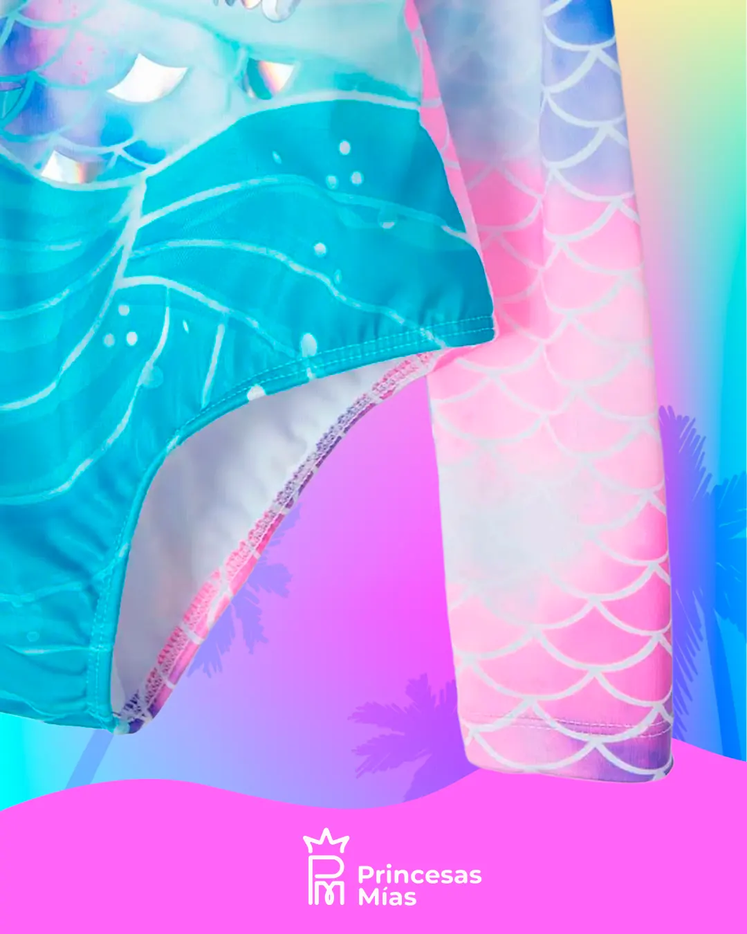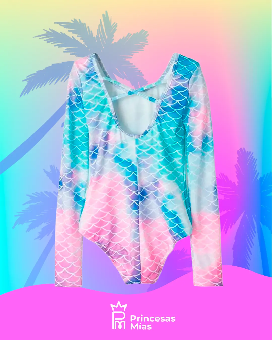 ¡Maravilloso y auténtico! Un vestido de baño sacado del océano. Cuenta con cuello redondo y manga larga para una comodidad de principio a fin. Tiras cruzadas en la espalda que la harán sentirse como toda una princesa libre y fabulosa. Estampado de colores y con detalles de brillantes que la harán verse tan perfecta como el mar.