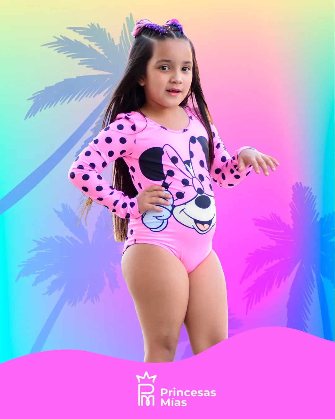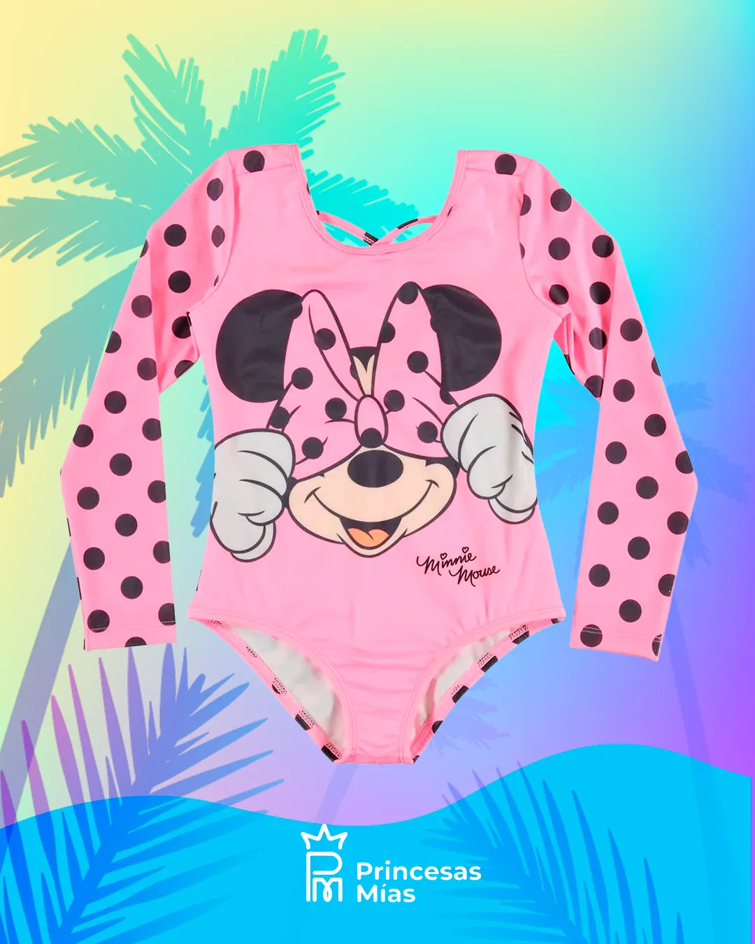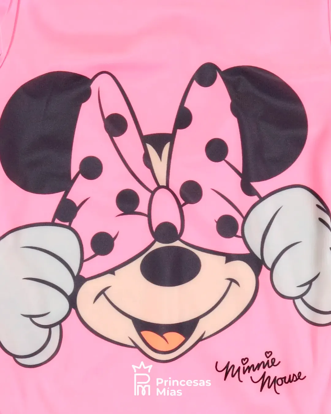 Baño para niña. Color:Rosa. Con diseño de Minnie. Licencia oficial de Minnie. Material: componente: entero ml , composición: 85% poliéster, 15% elastano, forro: 87% poliéster, 13% elastano. Detalle especial: aplique con brillo,el insumo puede presentar posibles variaciones por abastecimiento. Ideal para días llenos de juego y diversión.