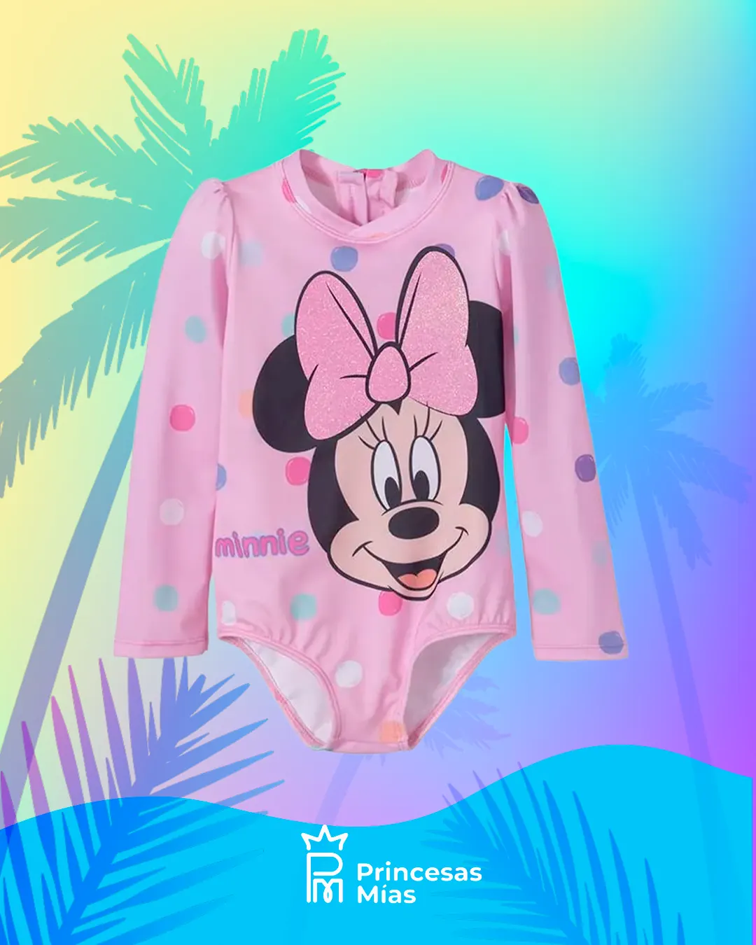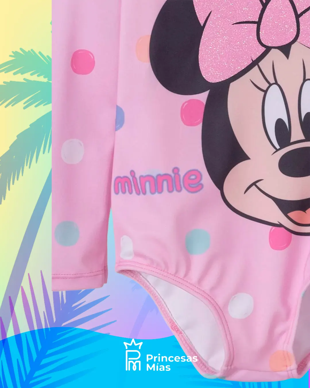 Días de sol, agua y mucha diversión con la ratoncita más adorable de la televisión. Este vestido de baño está diseñado para que tu pequeña juegue y brille como Minnie. Que empiece la diversión bajo el sol mientras disfruta de su manga larga con máxima protección que le darán ese aspecto tierno que tanto disfrutas en ella.Diseño: Vestido de baño entero de manga larga y cuello redondo con elongación, con ajuste de cierre en posterior y bolero en cintura. Cuenta con estampado en frente y estampado allover con apliques brillantes. 85% poliéster, 15% elastano, forro: 87% poliéster, 13% elastano