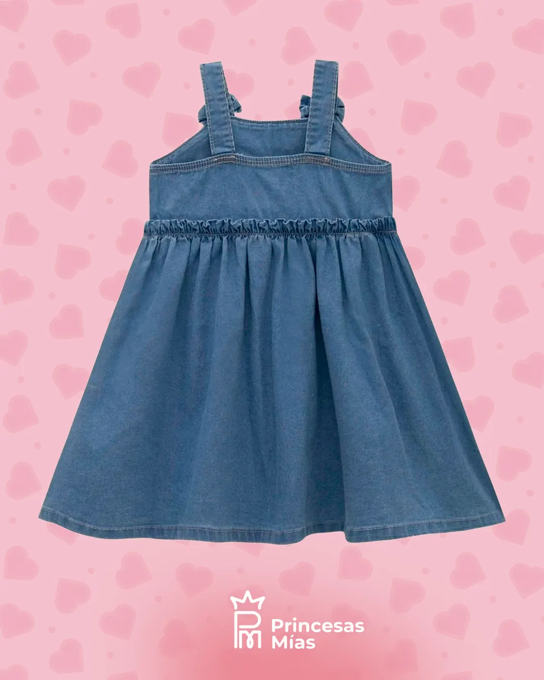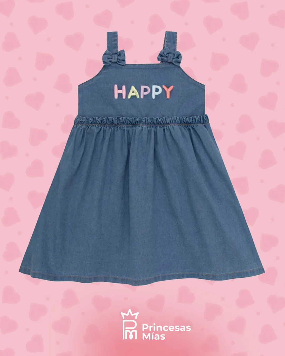 Vestido jeans Happy en denim liviano con elastano, pensado para acompañar cada momento de juego con mucha comodidad. El pecho trae la palabra HAPPY aplicada en colores pasteles, y los tirantes con nudos decorativos le dan un toque encantador. La falda amplia y con vuelo lo convierte en un aliado perfecto para los días de verano. Detalles del producto: Denim suave y liviano con elastano, más cómodo y flexible. Tirantes con nudos decorativos. Aplique frontal “HAPPY” en tonos multicolor. Falda con mucho movimiento, ideal para usar todos los días.