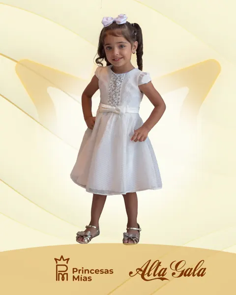 Este vestido blanco de gala es la definición de elegancia y dulzura. Confeccionado en un delicado tejido texturizado, se destaca por sus apliques de perlas en el frente que aportan brillo y distinción. La falda con caída natural ofrece volumen y movimiento, mientras que el lazo satinado en la cintura acentúa la silueta con un toque de encanto. Las mangas cortas con volados realzan el estilo clásico, convirtiéndolo en una opción ideal para ceremonias, cortejos, celebraciones y sesiones de fotos inolvidables. Material principal: Tejido texturizado de alta calidad con forro interno suave Diseño: Corte princesa Apliques de perlas brillantes en el frente Lazo satinado blanco en la cintura Mangas cortas abullonadas con acabado delicado Cierre posterior oculto para un ajuste cómodo