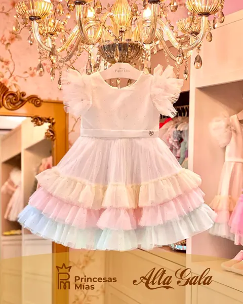 Un diseño delicado y encantador pensado para las más pequeñas. Este vestido exclusivo de la marca Petit Cherie combina la elegancia del blanco con volados de tul en suaves tonos pastel. La parte superior lleva un sutil brillo que ilumina cada movimiento, mientras que las mangas abullonadas de tul aportan un toque mágico. Características: Diseño exclusivo con detalles brillantes Mangas tipo tul abullonadas Volados en tonos pastel (amarillo, rosa, celeste) Corte clásico y cómodo Ideal para eventos especiales y sesiones de fotos Recomendado para: cumpleaños, bautismos, celebraciones familiares, fiestas de ensueño.