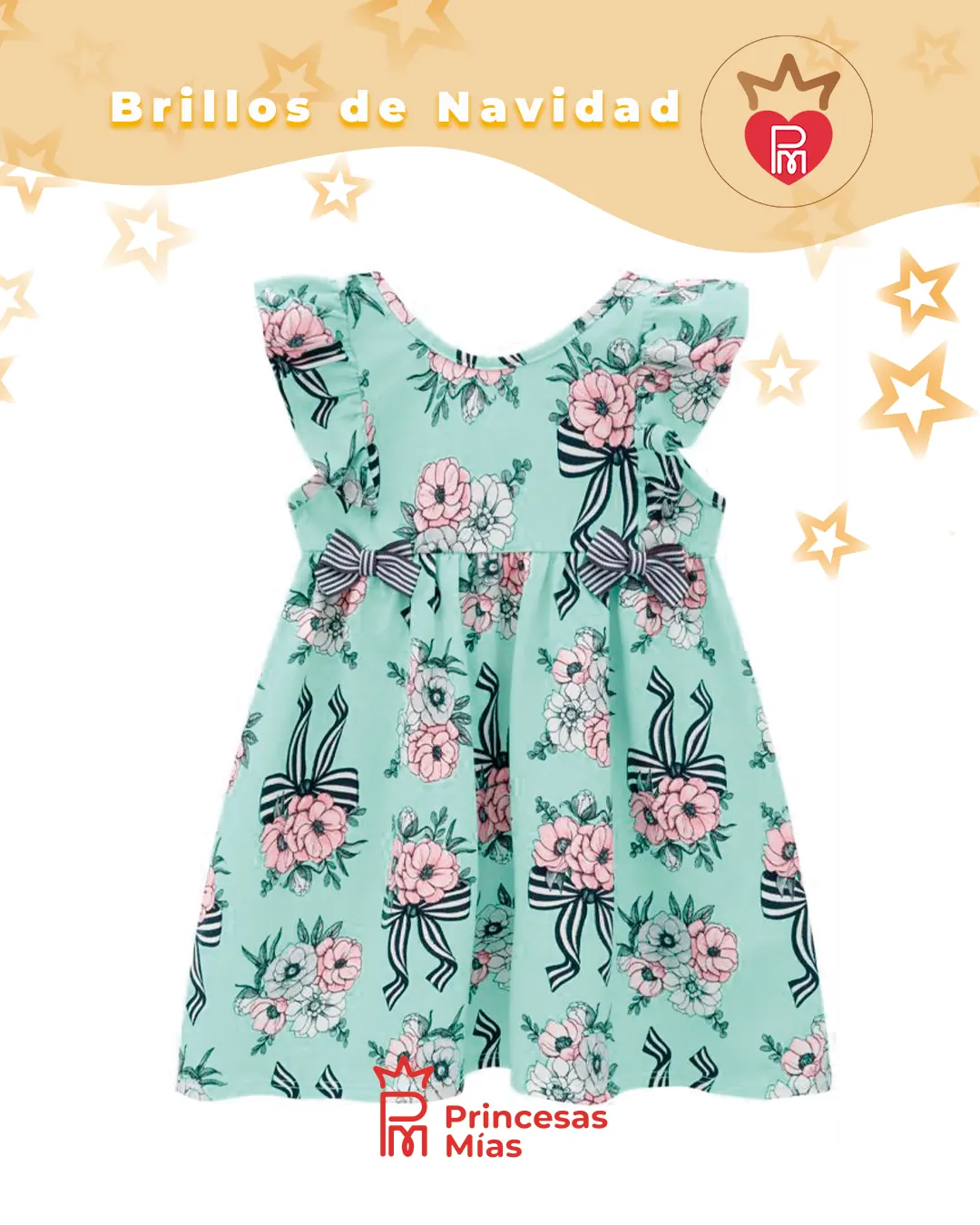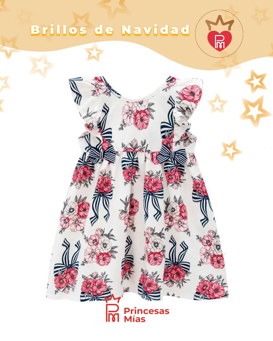 Vestido floral 100% algodón con volados Este vestido floral de algodón 100% es perfecto para las peques que necesitan comodidad sin perder estilo. Su tejido natural es suave, respirable y liviano, ideal para los días de calor, reuniones familiares y celebraciones especiales. El diseño trae un estampado de flores rojas con lazos en tono azul marino sobre fondo blanco, creando un look delicado y elegante Y El tiffany de fondo con flores rosas con moños azules. Las mangas con volados y el detalle fruncido en el pecho le dan movimiento y un toque muy infantil, haciendo que el vestido se vea precioso tanto en fotos como en el día a día. Es una opción versátil: se puede usar en Navidad, Año Nuevo, cumpleaños, salidas de verano y eventos escolares, siempre con la comodidad del algodón puro. Combinándolo con nuestros calzados, moños, vinchas y accesorios de Princesas Mías, puedes armar un conjunto completo y encantador. Ficha técnica Marca: Milon Modelo: Vestido floral con volados Tipo de prenda: Vestido infantil casual/festivo Color base: Blanco y tifanny Estampa: Flores rojas y lazos en azul marino Tela: Tejido plano de algodón Composición: 100% algodón Detalles de diseño: Escote redondo Mangas con volados Detalle fruncido/volado en el pecho Falda con vuelo suave, largo a la rodilla