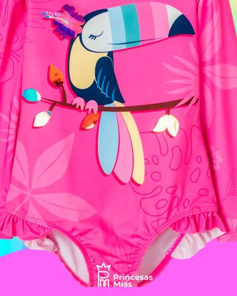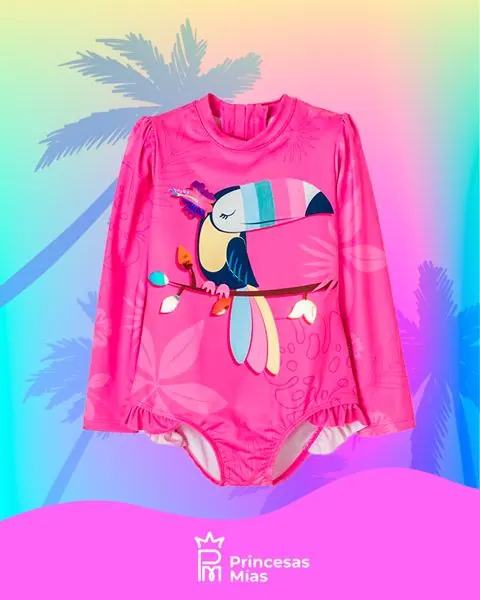 ¡A volar entre las olas! Este traje de baño entero de manga larga es ideal para pequeñas aventureras que aman el agua y el sol. Su color rosa vibrante y el simpático tucán tropical le dan un toque súper alegre, mientras que su diseño cómodo acompaña cada juego en la piscina, el mar o en casa. Y lo mejor: cuenta con protección solar UV 50 para mayor tranquilidad en los días de calor. Detalles: Traje de baño entero. Mangas largas para mayor cobertura. Estampado tropical con tucán. Diseño cómodo y suave al tacto. Ideal para piscina, playa o juegos bajo el sol. Protección solar UV 50. Composición: 85% poliéster, 15% elastano. Forro: 87% poliéster, 13% elastano.