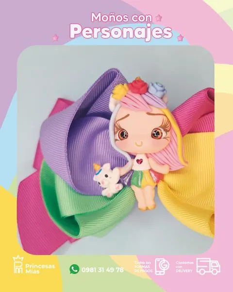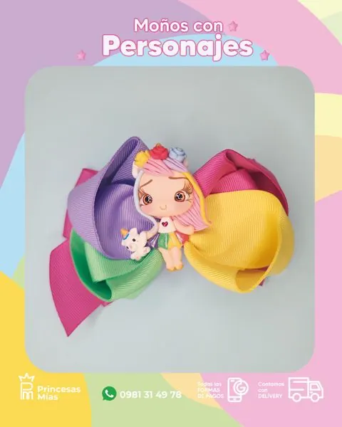Un moño lleno de color y ternura 💕. Esta combinación arcoíris mezcla tonos vibrantes y alegres que hacen que cualquier look se sienta más divertido y especial 🌈🎀. La muñequita central con estilo fantasy le da ese toque de “wow” que encanta a las peques y convierte el accesorio en protagonista ✨. Accesorios infantiles hechos a mano con amor, delicadeza y encanto. 💖 ¡Cada lazo lleva cuidado, calidad y un toque especial que transforma cada momento en magia! 🎀