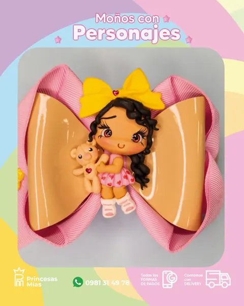 Descripción corta: Moño en rosa candy 💗 con detalles en caramelo suave 🍯 y una tierna muñequita de rulitos abrazando su osito 🧸✨ Un diseño dulce y encantador para sumar ternura y estilo en cada día 🌸🎀 Accesorios infantiles hechos a mano con amor, delicadeza y encanto. 💖 ¡Cada lazo lleva cuidado, calidad y un toque especial que transforma cada momento en magia! 🎀