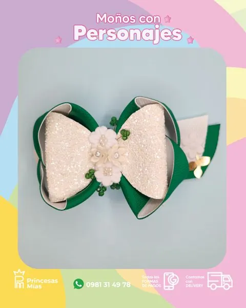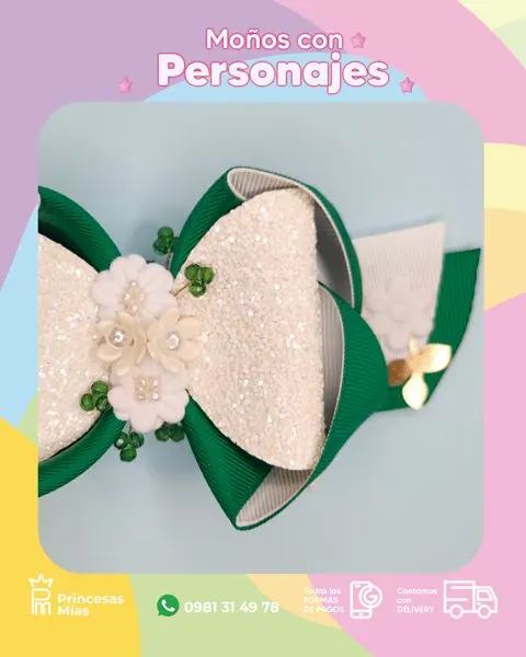 Descripción corta: Moño verde esmeralda 💚✨ con brillo blanco tipo glitter 🤍 y detalles florales con perlitas 🌼🤍 un diseño elegante y delicado que ilumina cualquier look con un toque romántico y súper fino 🎀💫 Accesorios infantiles hechos a mano con amor, delicadeza y encanto. 💖 ¡Cada lazo lleva cuidado, calidad y un toque especial que transforma cada momento en magia! 🎀