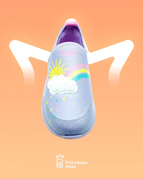 enis infantil con diseño alegre y colorido que representa sol, nube y gotas de lluvia. Suela con luces LED integradas que se activan al caminar. ¡Una experiencia mágica para cada paso! Beneficios: Luces en la suela que brillan con el movimiento. Diseño sin cordones: calce fácil y rápido. Material textil suave y respirable. Plantilla interna anatómica y cómoda. Suela antideslizante y flexible. Materiales: Exterior: textil con acabado glitter. Interior: textil respirable. Suela: goma EVA con luces LED. Colores: Multicolor pastel (lila, rosa, amarillo, celeste).