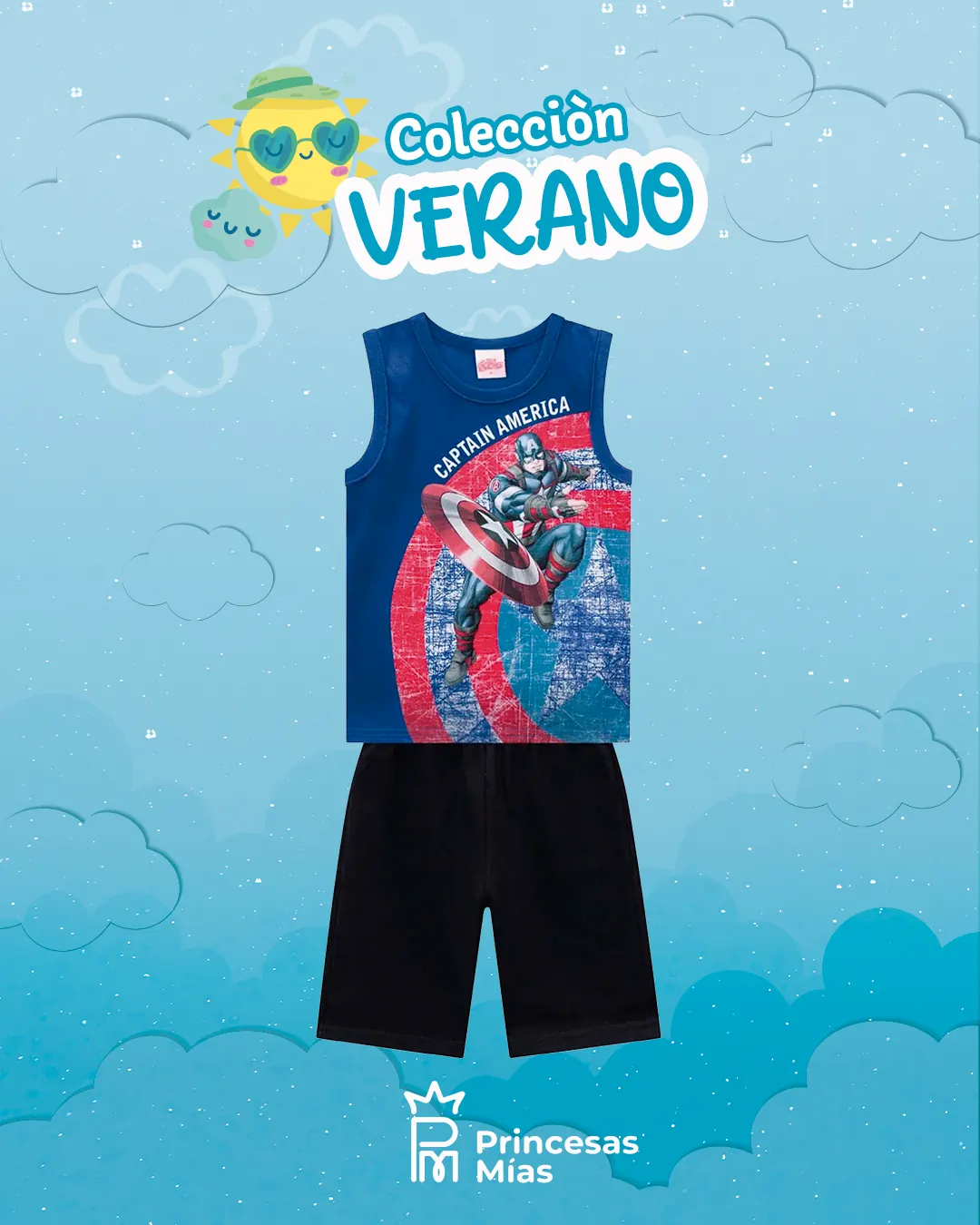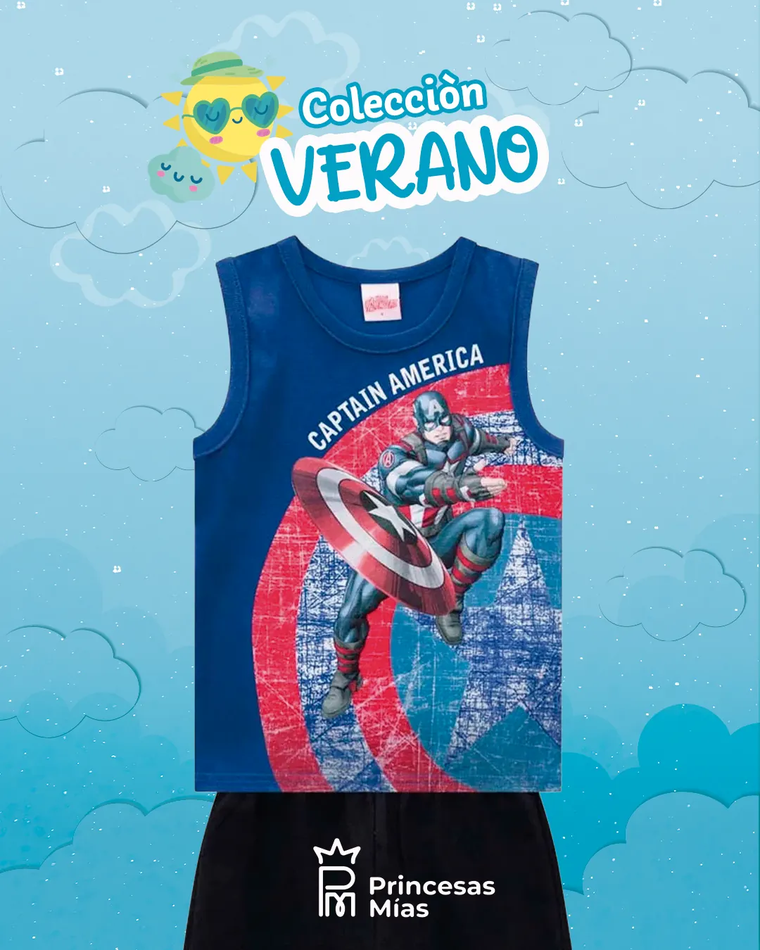 Conjunto infantil verano Capitán América para niño. Incluye musculosa azul con gran estampado frontal del superhéroe y su escudo, y bermuda negra cómoda y fresca. Confeccionado en telas suaves, ideal para los días de calor, acompaña a los peques en cada juego con el estilo valiente de su héroe favorito.