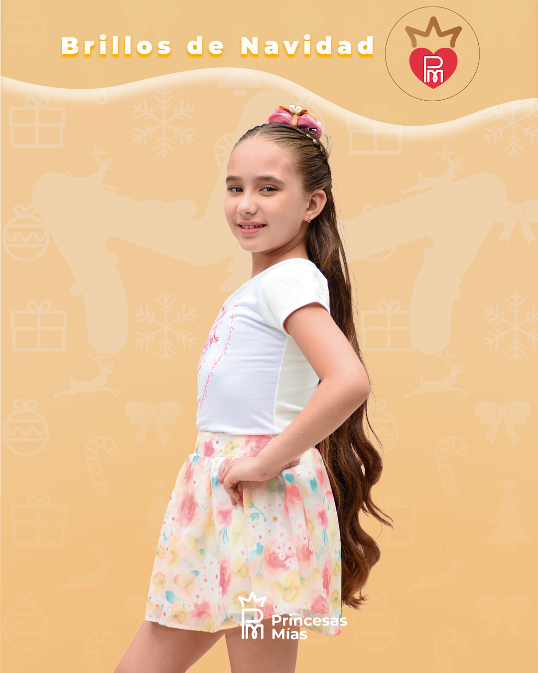 Este conjunto helado floral de Princesas Mías es ideal para las peques que aman los colores suaves y los detalles delicados. La remera blanca trae una estampa de cucurucho con flores en forma de corazón, con toques de brillo que iluminan el look sin perder la ternura infantil. Las mangas cortas levemente abullonadas aportan un toque romántico y muy femenino. La falda tiene una caída hermosa gracias a su capa superior tipo tul/gasa estampada en tonos pastel: rosa, durazno, amarillo suave y toques de verde. Es liviana, con movimiento y perfecta para girar, bailar y disfrutar de las fiestas con total comodidad. Es un conjunto versátil que se puede usar en cumpleaños, paseos, fotos al aire libre y salidas de verano, combinando siempre comodidad y estilo. Podés sumarle nuestros calzados, moños y vinchas de Princesas Mías para lograr un look aún más dulce y completo.