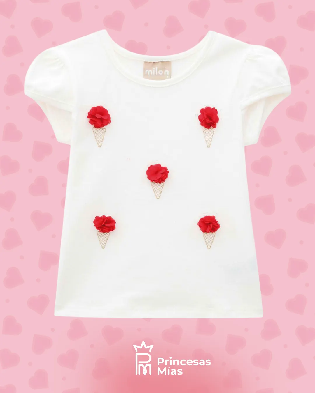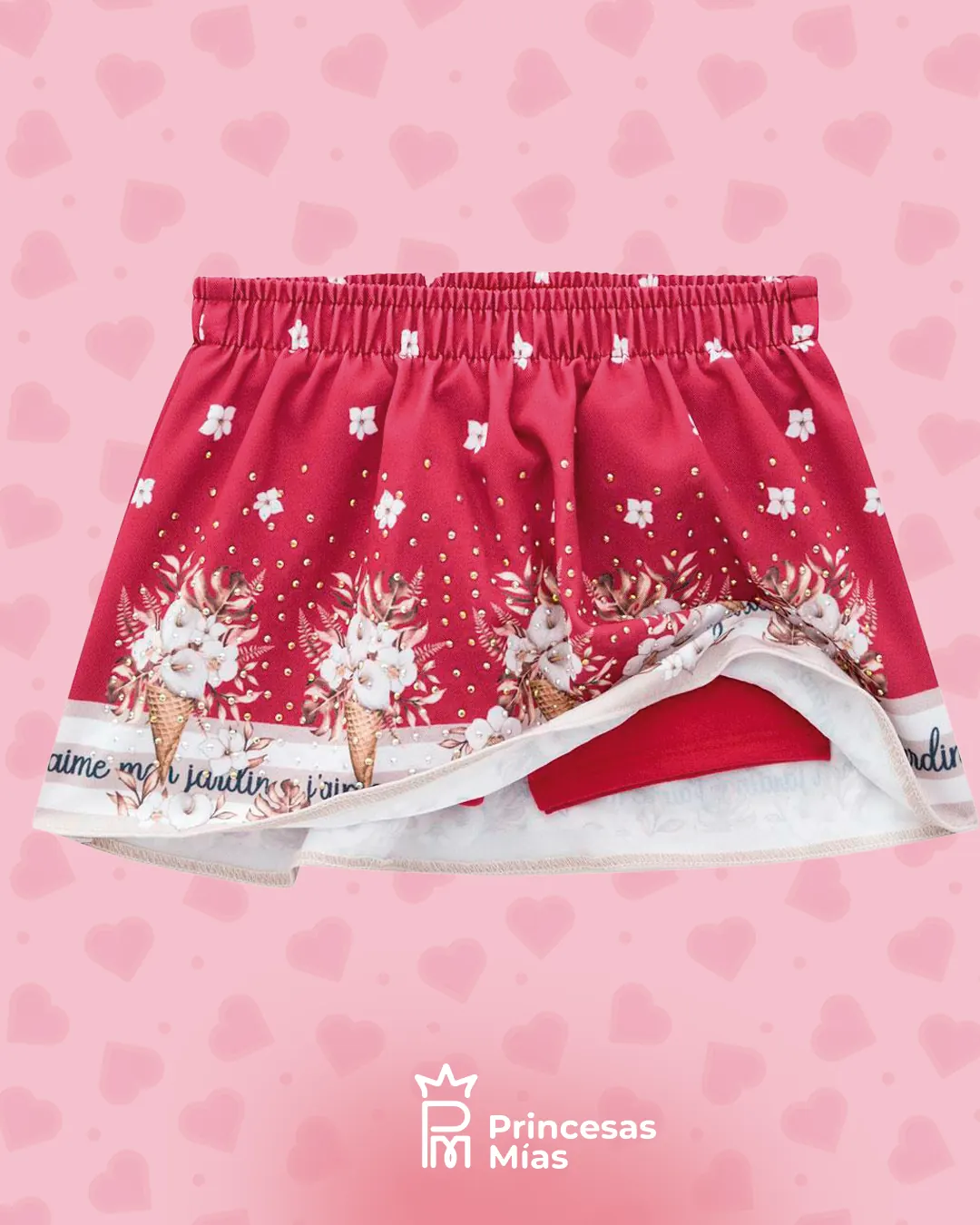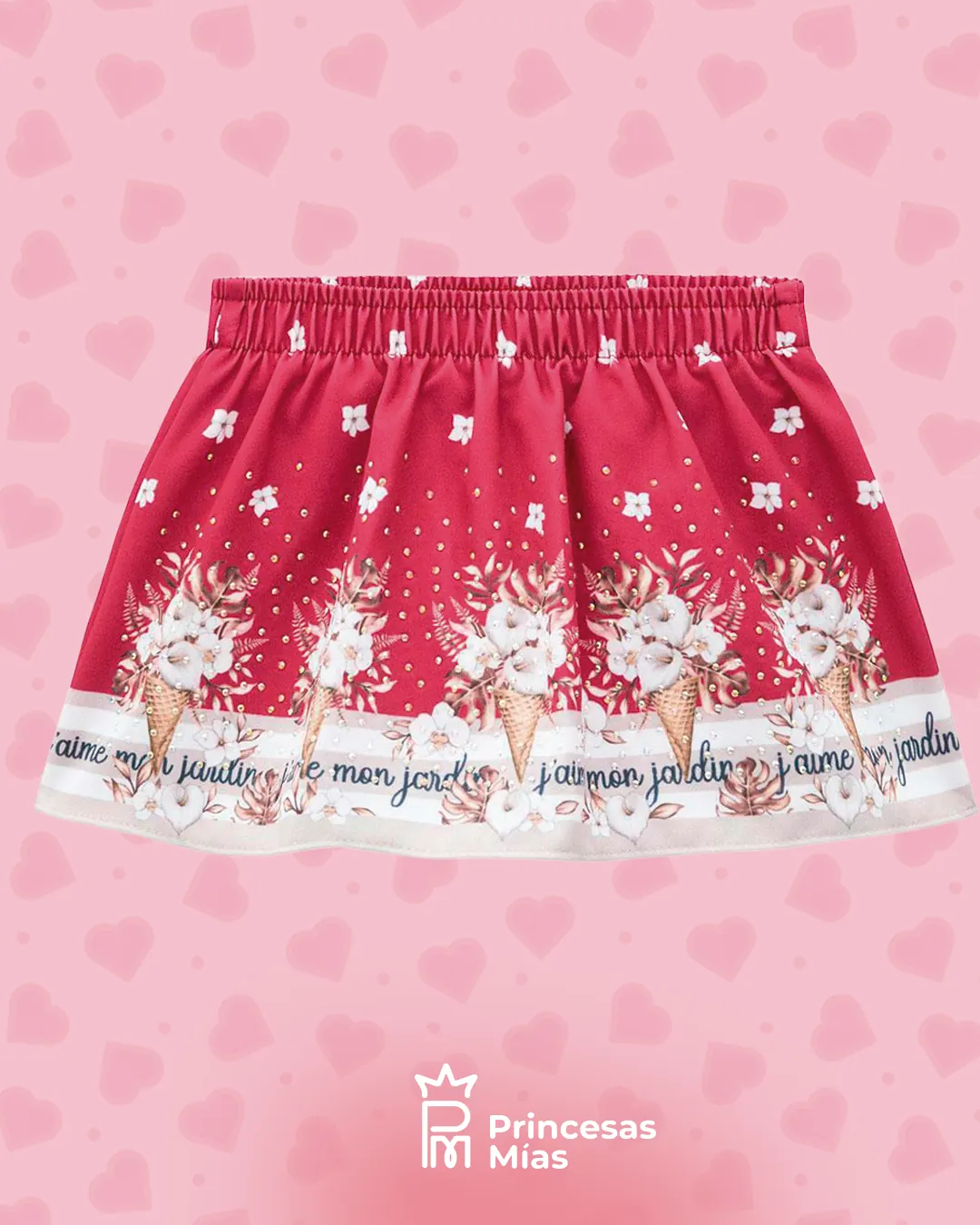 Conjunto de niña de manga corta con falda estampada de la marca Milon. Fabricado en tejido mezcla de algodón y poliéster, proporcionando así una mayor comodidad. Blusa de punto de manga corta con aplicaciones de tul que simulan pequeños conos de helado, muy mona. Una falda con un estampado repetido de ramos de flores sobre conos de helado: ¡qué glamour! Pantalones cortos con forro. Completamente decorado con pedrería. Una gran opción para los días calurosos. Un conjunto del que tu pequeño no podrá prescindir. DATOS ADICIONALES - El paquete contiene: 1 blusa y 1 falda. - Tejido: Algodón y poliéster.