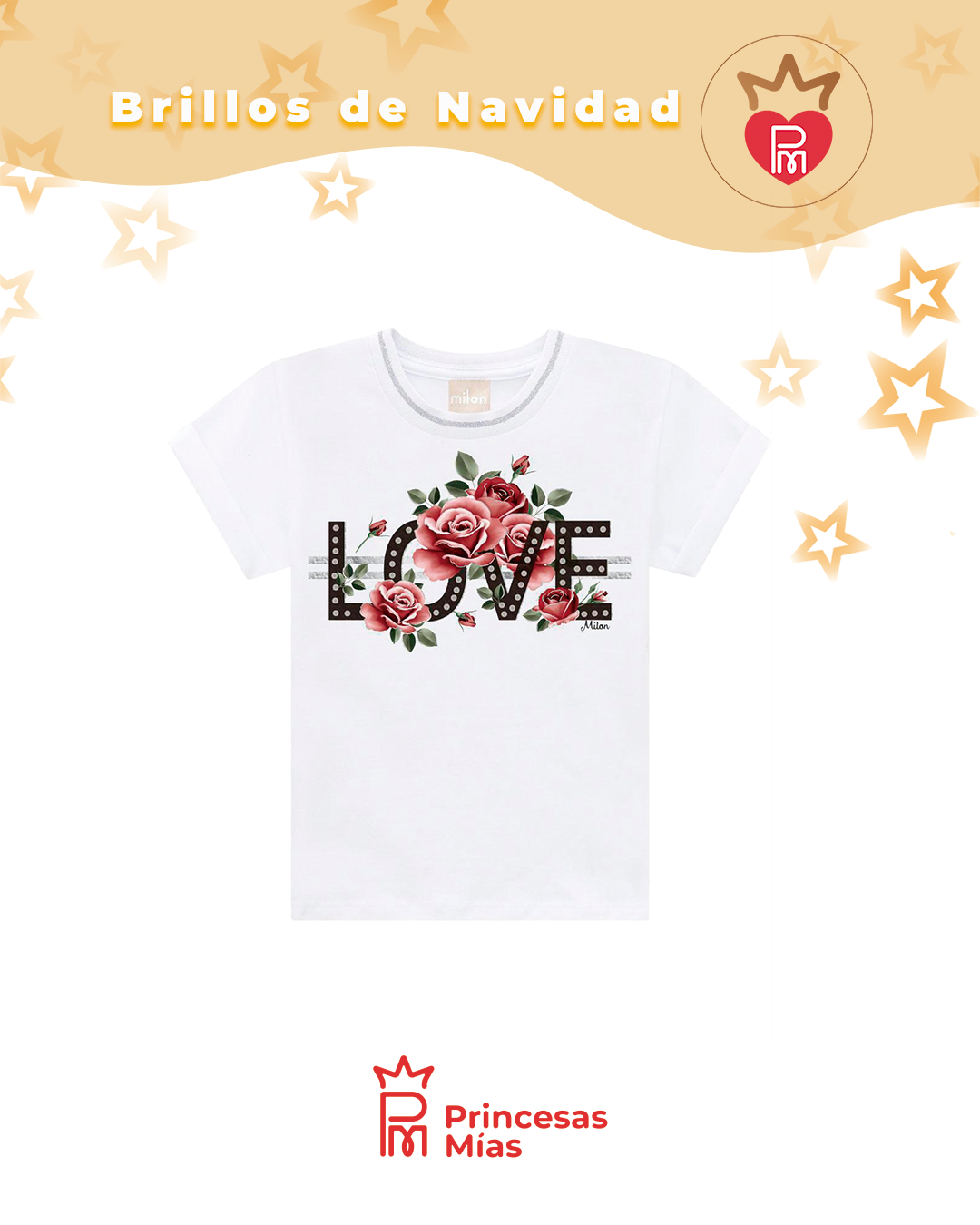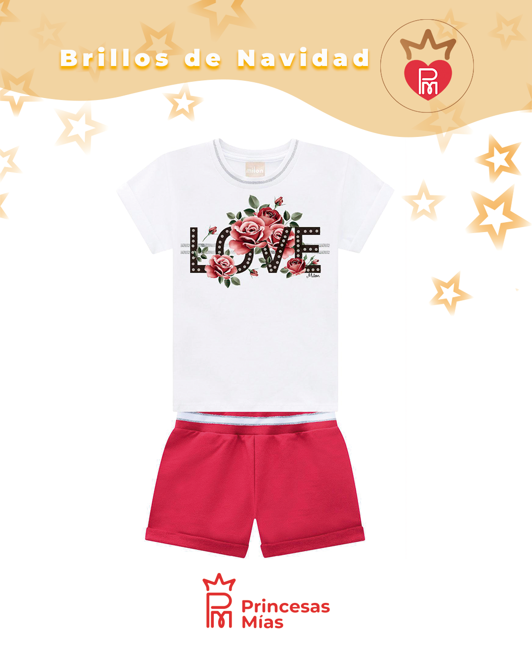 Descripción detallada Este conjunto Milon es perfecto para las peques que aman verse lindas sin perder la comodidad del día a día. La remera blanca trae la palabra LOVE decorada con flores y rositas en tonos rosa y rojo, creando un diseño dulce y delicado que combina perfecto con la temporada de fiestas y con cualquier salida de verano. El short rojo completa el look con un toque de color intenso, ideal para combinar con zapatillas, sandalias o balerinas. Es un conjunto liviano, cómodo y práctico, pensado para que tu niña pueda jugar, correr y disfrutar sin sentirse ajustada. Es una excelente opción para Navidad de día, reuniones familiares, paseos, vacaciones, cumpleaños y uso diario con estilo. Podés sumarle moños, vinchas y calzados de Princesas Mías para lograr un outfit aún más encantador. ALGODON 100%