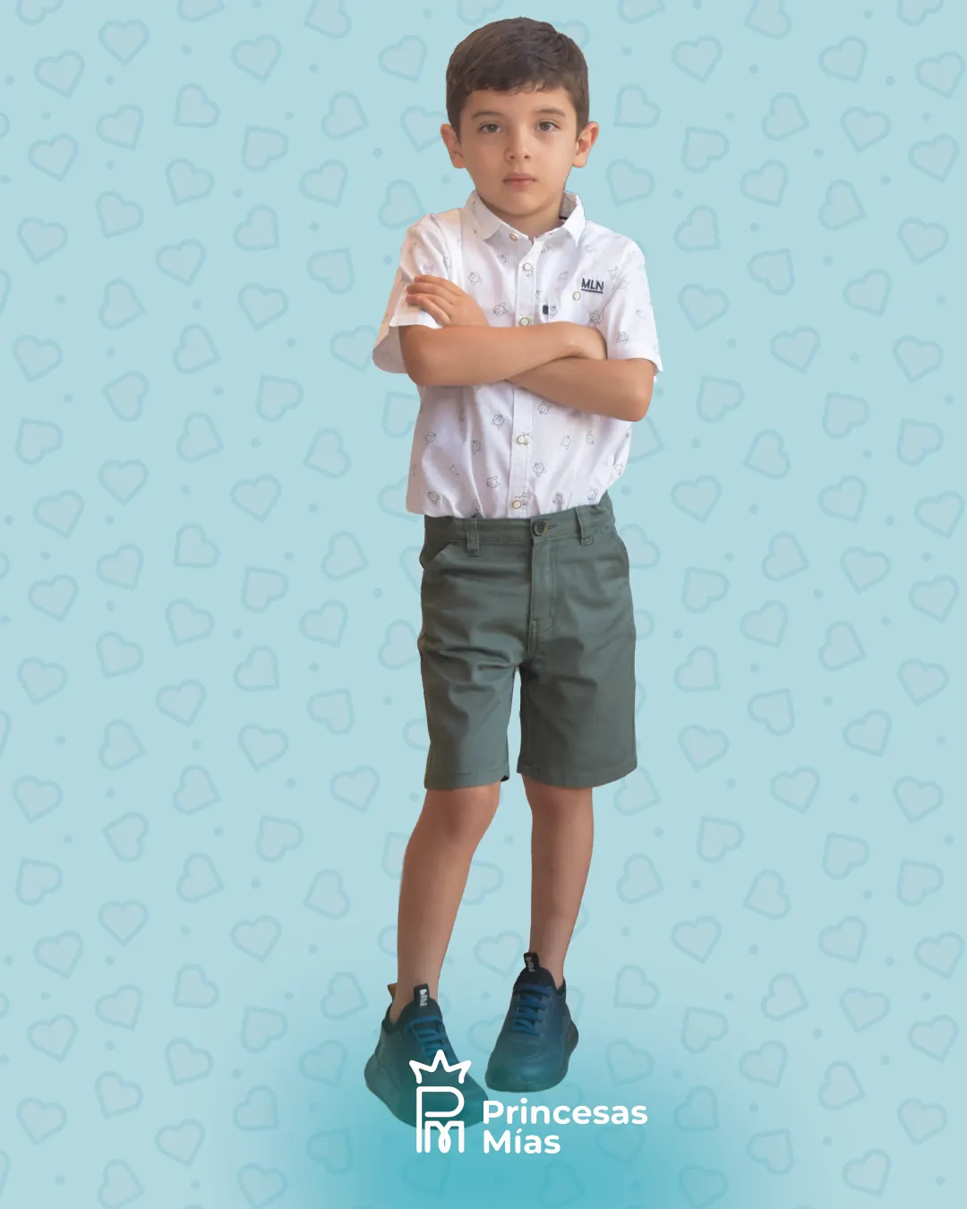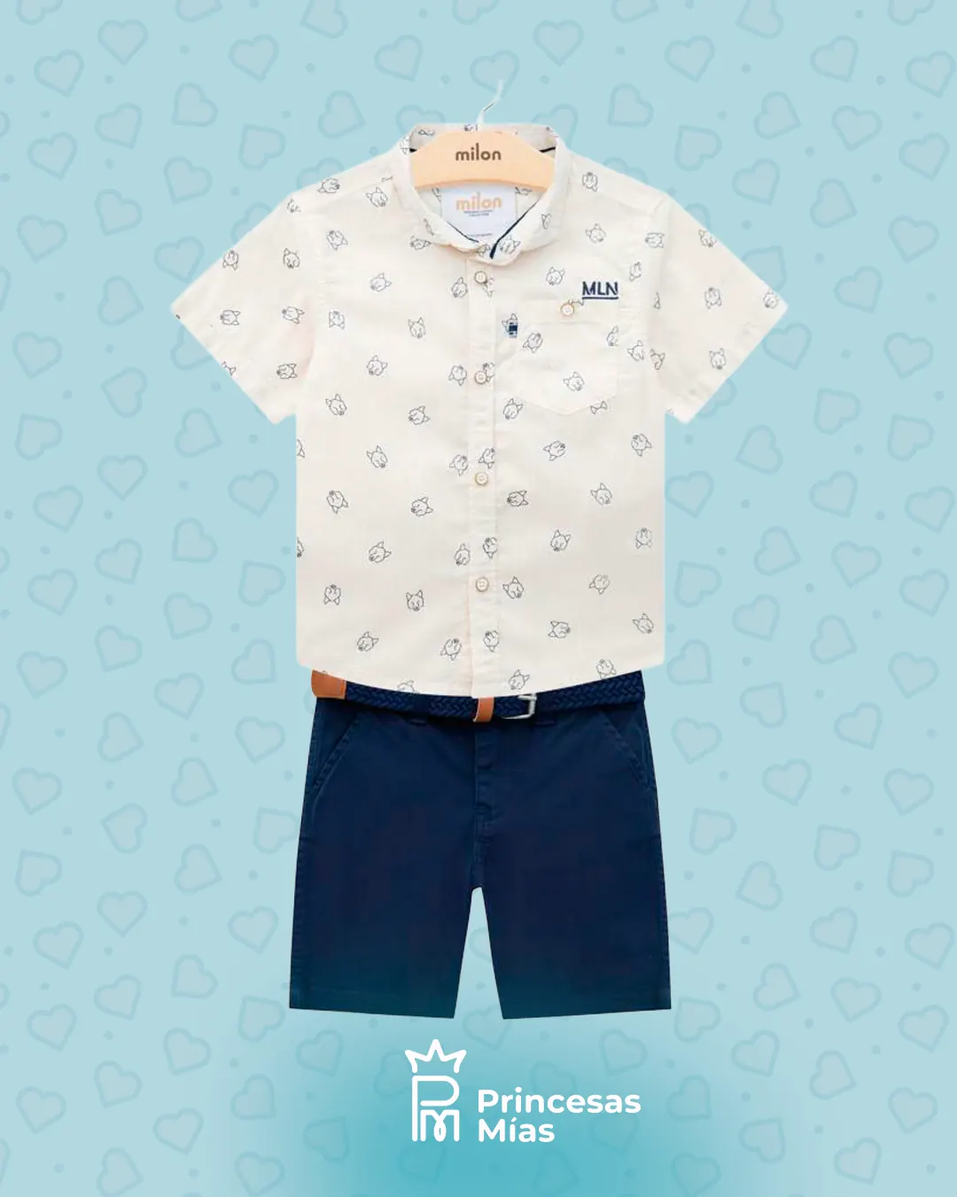 Conjunto camisa y bermuda Milon niño Un look clásico y delicado para los pequeños caballeros de la casa. La camisa manga corta, en tono claro con mini estampados y bolsillo frontal, aporta un aire elegante pero súper cómodo para los días de calor. Se combina con una bermuda tipo chino, de tejido suave y con bolsillos, ideal para moverse y jugar sin perder el estilo. Perfecto para cumpleaños, reuniones familiares o eventos especiales donde tu peque quiera lucir prolijo y encantador. 💙