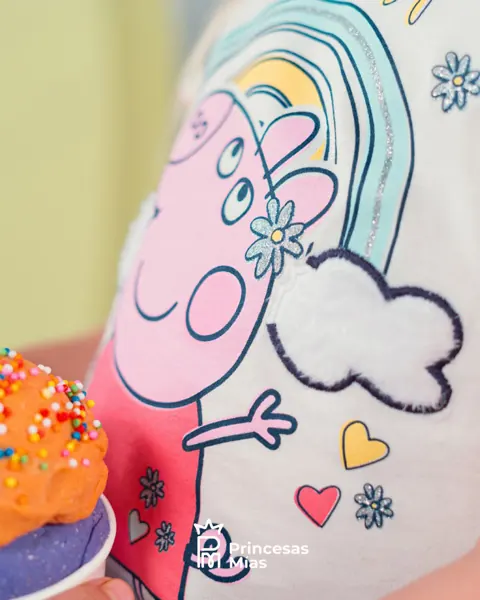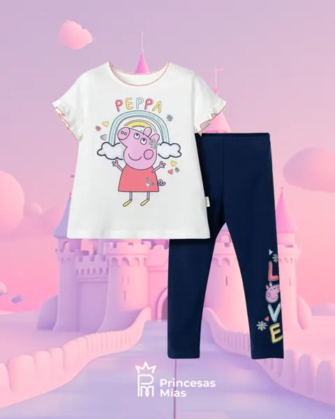 n conjunto encantador para las pequeñas fans de Peppa Pig. Su diseño alegre, colorido y funcional lo convierte en la elección perfecta para el día a día, salidas especiales o momentos de juego. 👕 Remera blanca con voladitos: Estampado frontal de Peppa Pig bajo un arcoíris, rodeada de nubes y corazones. Mangas con volados y pespunte rosa, detalles delicados que marcan la diferencia. Cuello redondo con terminación festoneada. 👖 Legging azul marino: Confeccionado en tejido suave y elástico para total libertad de movimiento. Estampado lateral con la palabra "LOVE" y detalles de Peppa y flores. 🌟 Composición: 100% algodón (remera) | 95% algodón, 5% elastano (legging) 🎨 Colores: Blanco (remera) y azul marino (legging) con detalles multicolores.