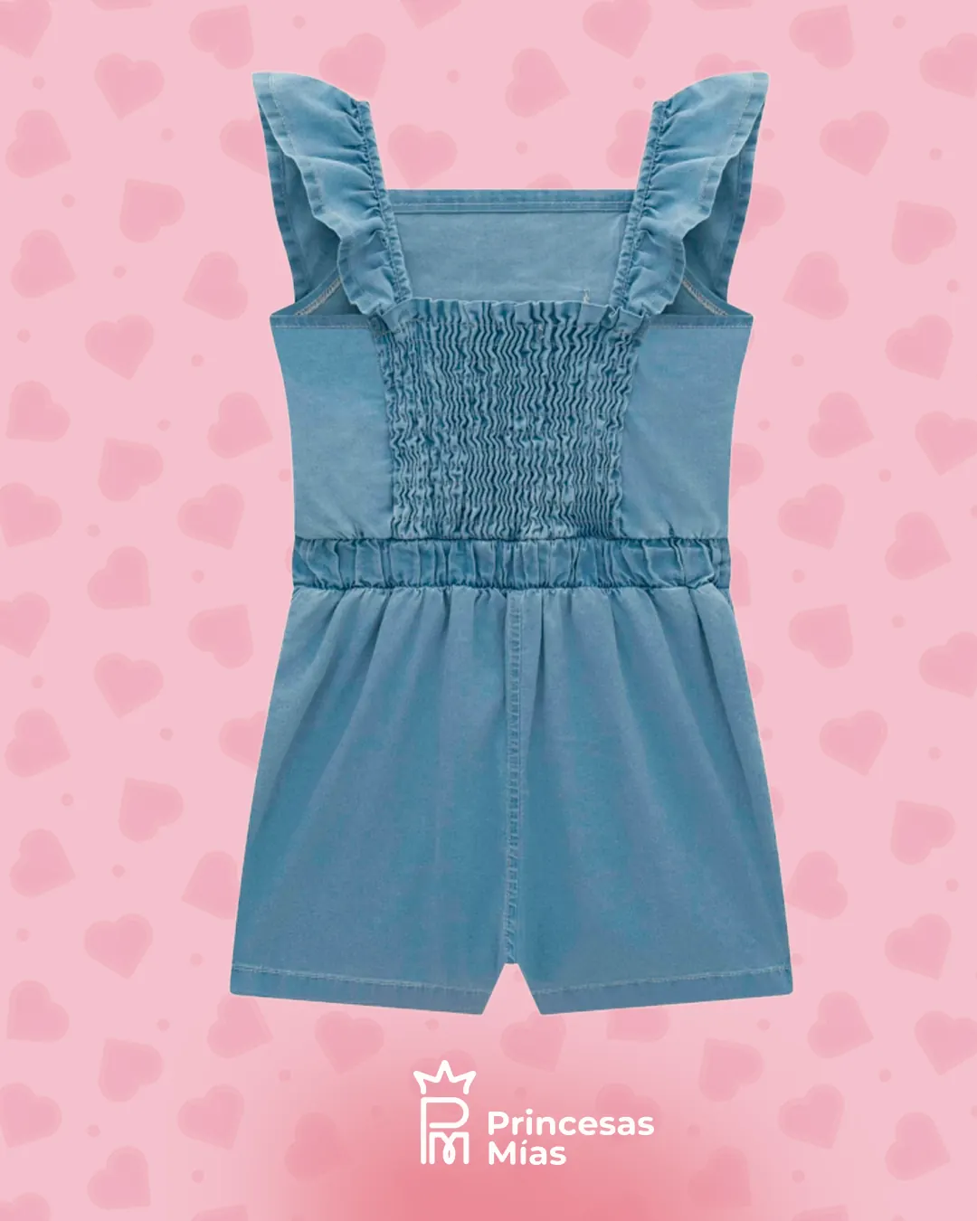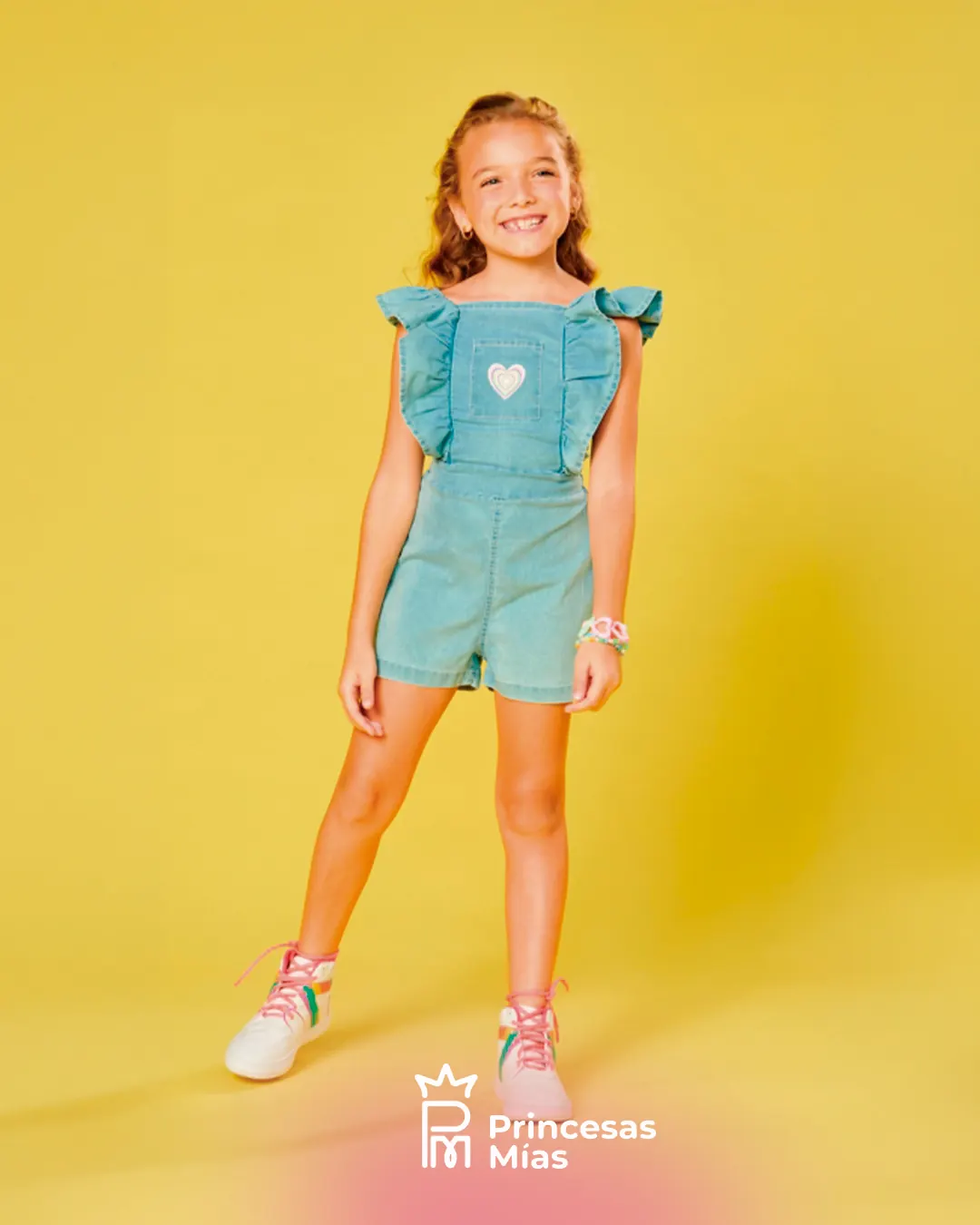 Enterizo de jeans suave con elastano, perfecto para las pequeñas que aman verse lindas y sentirse cómodas. 💙 Tiene breteles con volados que enmarcan el pechito, short amplio para moverse y jugar sin límites y un bolsillo frontal con bordado de corazoncito multicolor que aporta un toque dulce y divertido. El denim liviano y elasticado se adapta al cuerpo sin apretar, ideal para usar todo el día en días de paseo, cumpleaños o salida en familia. Detalles que encantan: Tejido de jean liviano con elastano, suave al tacto. Breteles con volados y bolsillito frontal. Bordado de corazón arcoíris que le da el toque mágico al look.