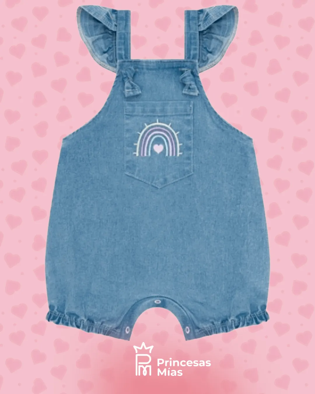 Enterito de jean suave con elastano para bebé, ideal para acompañar sus primeras aventuras con mucha comodidad. 💙 Con breteles con volados y calce amplio, es perfecto para que tu peque se mueva, gatee y juegue sin molestias. El detalle bordado de arcoíris con corazoncito en el bolsillito frontal aporta ese toque tierno que hace que el look sea aún más especial. Detalles que enamoran: Jean liviano y suave con elastano, cómodo para la piel del bebé. Breteles con volados que enmarcan la pechera. Bolsillo frontal con bordado de arcoíris y corazón. Piernas con elástico y broches a presión en la entrepierna para facilitar el cambio de pañal.