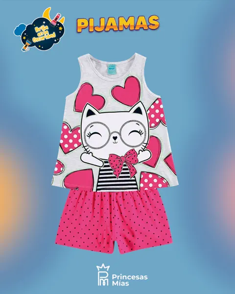 Pijama de verano para niña en azul marino con estampado de gato de la marca Kyly. Confeccionado en punto jersey, lo que lo hace aún más cómodo. Gracias a la calidad de Kyly, este pijama para niña es ideal para el día a día. Perfecto para que las niñas duerman plácidamente y con comodidad. Material: Algodón - jersey de punto Color: Azul Marca: Kyly
