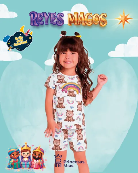 Los pijamas de osito de peluche que brillan en la oscuridad para niños de la marca Kyly tienen un diseño liviano y cómodo, lo que los convierte en una excelente opción para las noches de las princesitas. Camiseta Modelo de manga corta. Cuello redondo. - Impresión rotativa con fondo de osito de peluche y frente de arcoíris que brilla en la oscuridad. Bermudas - Cinturilla con elástico incorporado. - Estampado de osito de peluche giratorio. TEJIDO Malla. COMPOSICIÓN 98% poliéster, 2% elastano
