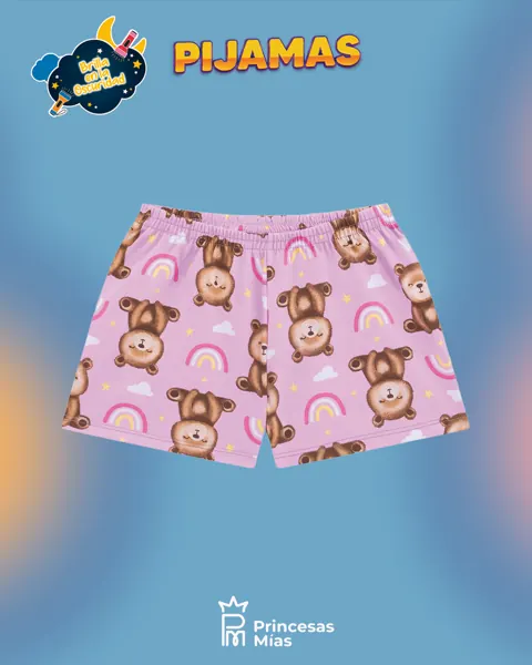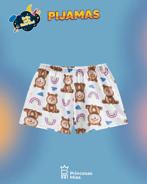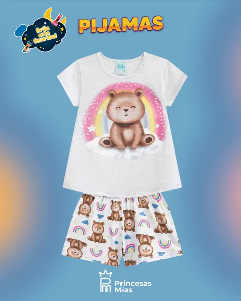 Osita, arcoíris y ternura total. Pijama fresquito con estampa central y short estampado. Brilla en la oscuridad para noches mágicas. Detalles: 2 piezas: remera + short Estampa Osita + arcoíris Brilla en la oscuridad Cintura elástica