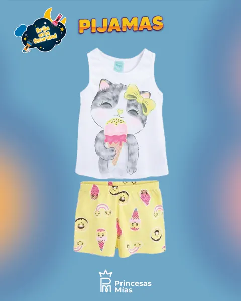 Dulce, cómoda y súper fresca ✨ Este pijama infantil Kyly es ideal para las noches cálidas y las siestas de vacaciones. La musculosa en tono gris claro trae un diseño adorable de gatita con moño rosa disfrutando un heladito, mientras que el short rosa viene estampado con heladitos y caritas sonrientes, aportando un toque divertido y encantador. Su calce es cómodo y liviano, pensado para que las peques se muevan libres y descansen felices 💗 Detalles Marca: Kyly Incluye: 2 piezas (musculosa + short) Color: gris claro + rosa Estampa: gatita con helado / heladitos y dibujos divertidos Ideal para: verano, días calurosos, vacaciones, dormir y estar en casa Cintura: elástico suave para mejor ajuste