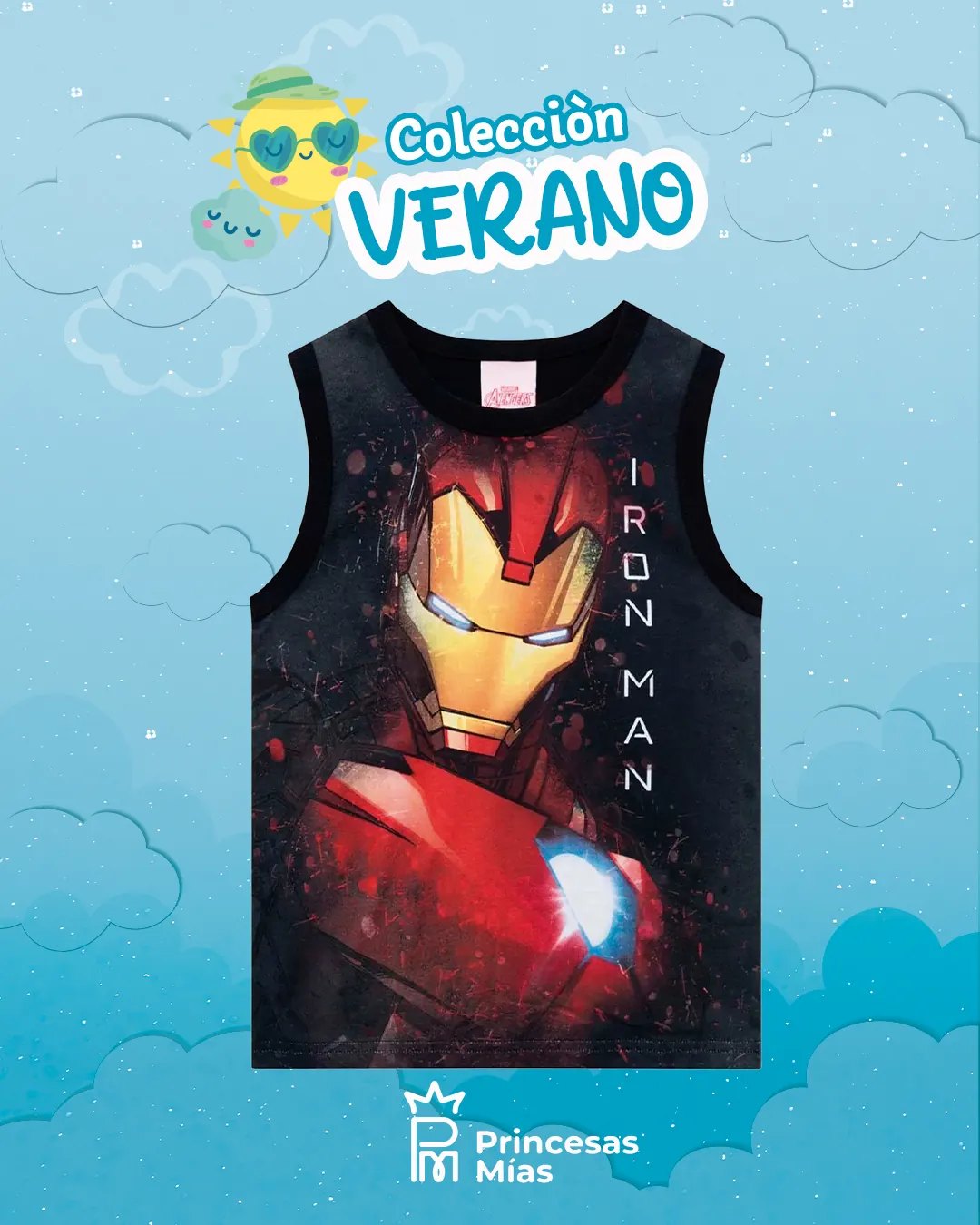 Musculosa infantil de Iron Man, en color negro con estampado frontal del superhéroe en tonos rojos súper intensos. 👌✨ Tejido suave y fresco, ideal para los días de verano y para todos los peques fanáticos de Marvel que aman jugar y moverse con libertad. 💥🦸♂️ Color ROJO Y NEGRO
