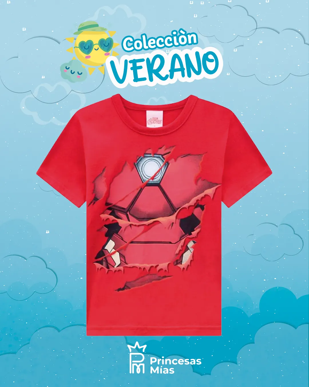 Remera infantil Iron Man con efecto de “armadura rasgada” ❤️🔥 El diseño muestra el pecho del superhéroe con su reactor brillante, como si la armadura saliera de la remera, ¡perfecta para peques fanáticos de Marvel! Tela suave y fresquita, ideal para acompañar todas sus aventuras del verano. 🤖✨
