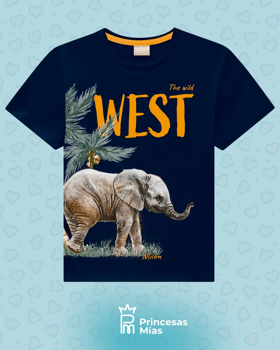 Remera infantil Milon “West” elefante – azul marino Remera manga corta en tono azul marino con estampa frontal de elefante y palmera, ideal para los peques que aman los animales y las aventuras. El diseño combina letras en color mostaza con ilustración estilo safari, dándole un toque moderno y divertido. Confeccionada en tejido de punto suave y agradable al tacto, es perfecta para el día a día: fresca, cómoda y fácil de combinar con jeans, bermudas o joggers. Una prenda práctica y con mucha personalidad para sumar al ropero de tu pequeño explorador. 🐘💛