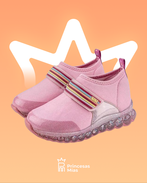 Un modelo encantador que combina diseño, comodidad y mucha diversión. Estos tenis Bibi se destacan por su sistema de luces LED en la suela que se iluminan con cada paso, brindando alegría en cada movimiento. Confeccionados en material suave y flexible, garantizan un calce perfecto y fácil gracias al cierre con velcro, adornado con una tira de colores tipo arcoíris. Su interior forrado y la exclusiva plantilla Fisioflex proporcionan sensación de caminar descalzo. Características destacadas: Luces LED multicolores que se activan al caminar. Diseño rosa pastel con detalles brillantes. Cierre con velcro ajustable para mayor practicidad. Plantilla Fisioflex: comodidad total para pies en crecimiento. Suela antideslizante y flexible.