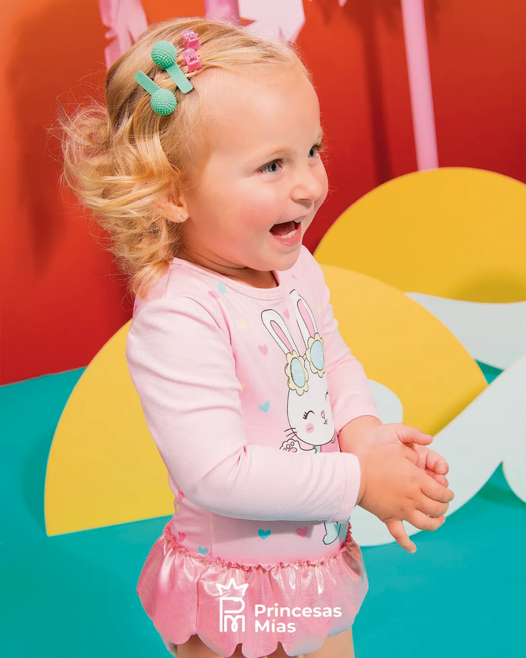 Conjunto de traje de baño UV50+ con diseño de conejito y tutu rosa brillante. Ideal para proteger la piel delicada del sol, con mangas largas y materiales suaves. Perfecto para un verano lleno de estilo y protección.