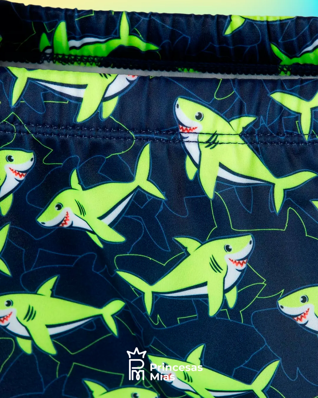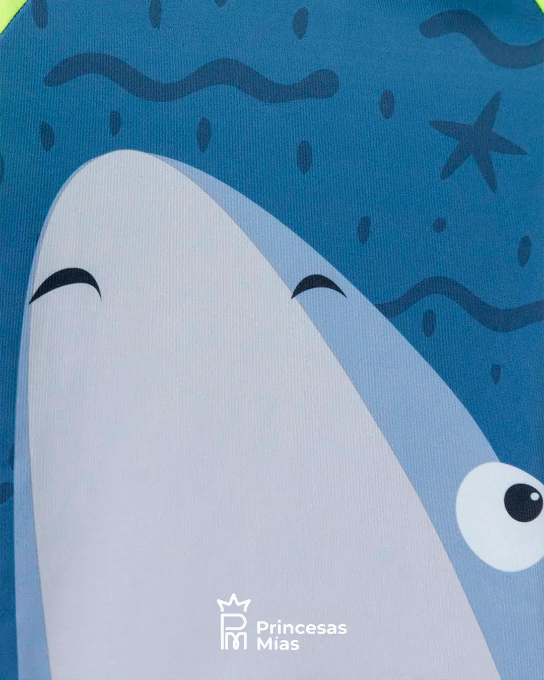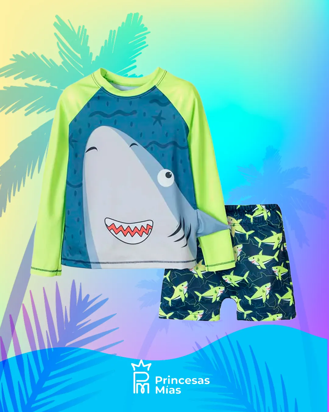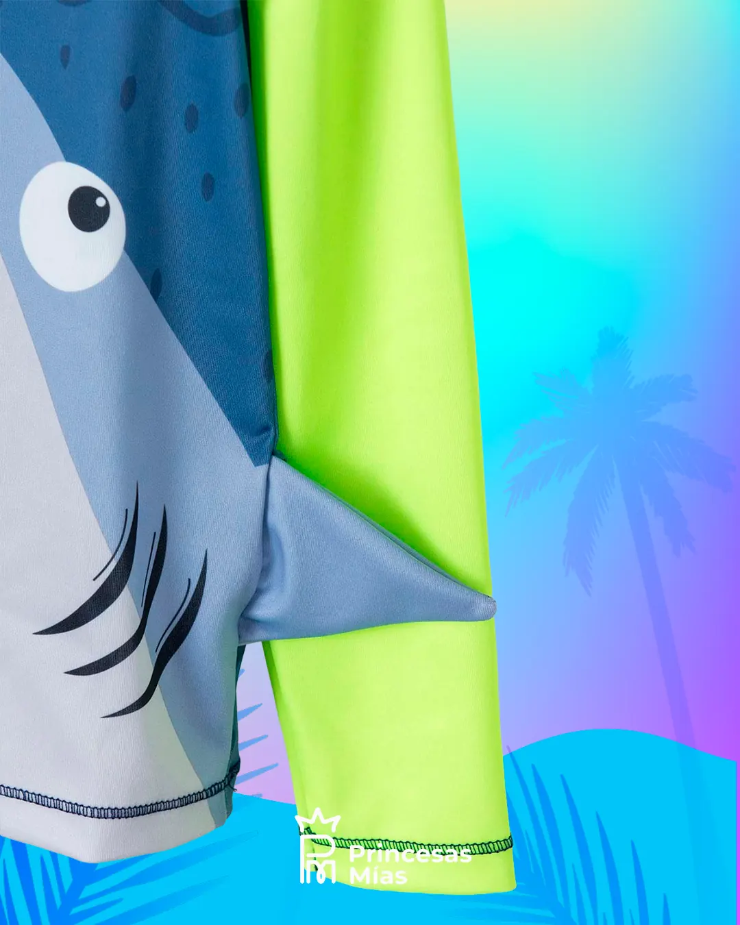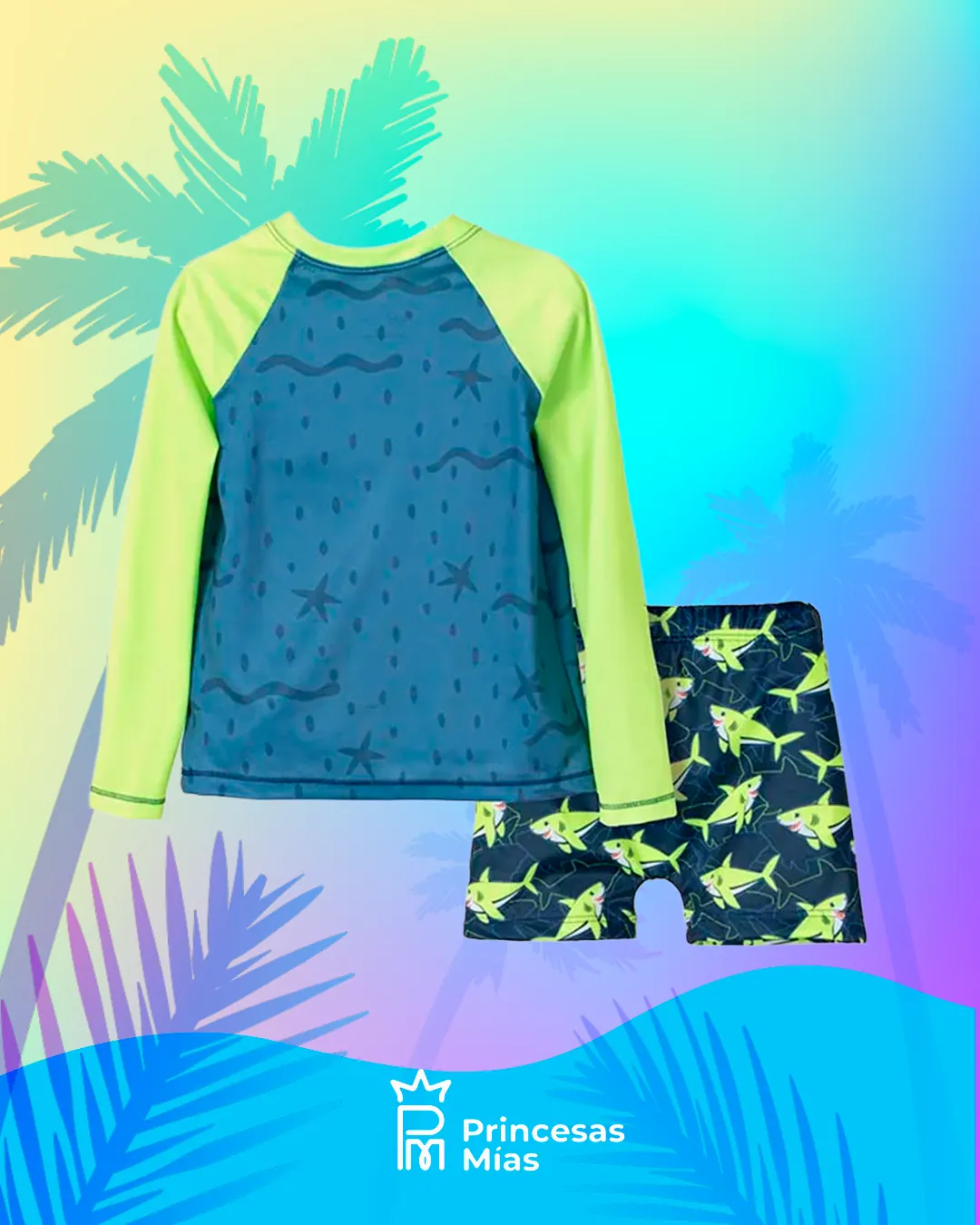 ¡Cómodo y con estilo! Conjunto de baño con camiseta manga larga que permitirá mayor diversión y protección del sol. Su bóxer con estampado de tiburones y la camiseta con una aleta en la parte posterior hará que se sienta seguro y como un pez en el agua. Nadar nunca fue tan divertido. Composición 87% Poliéster 13% Elastano Forro 90% Poliéster 10% Elastano
