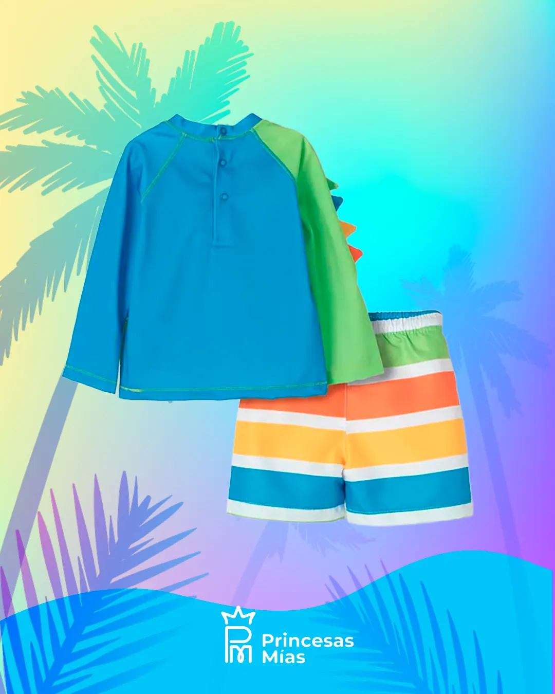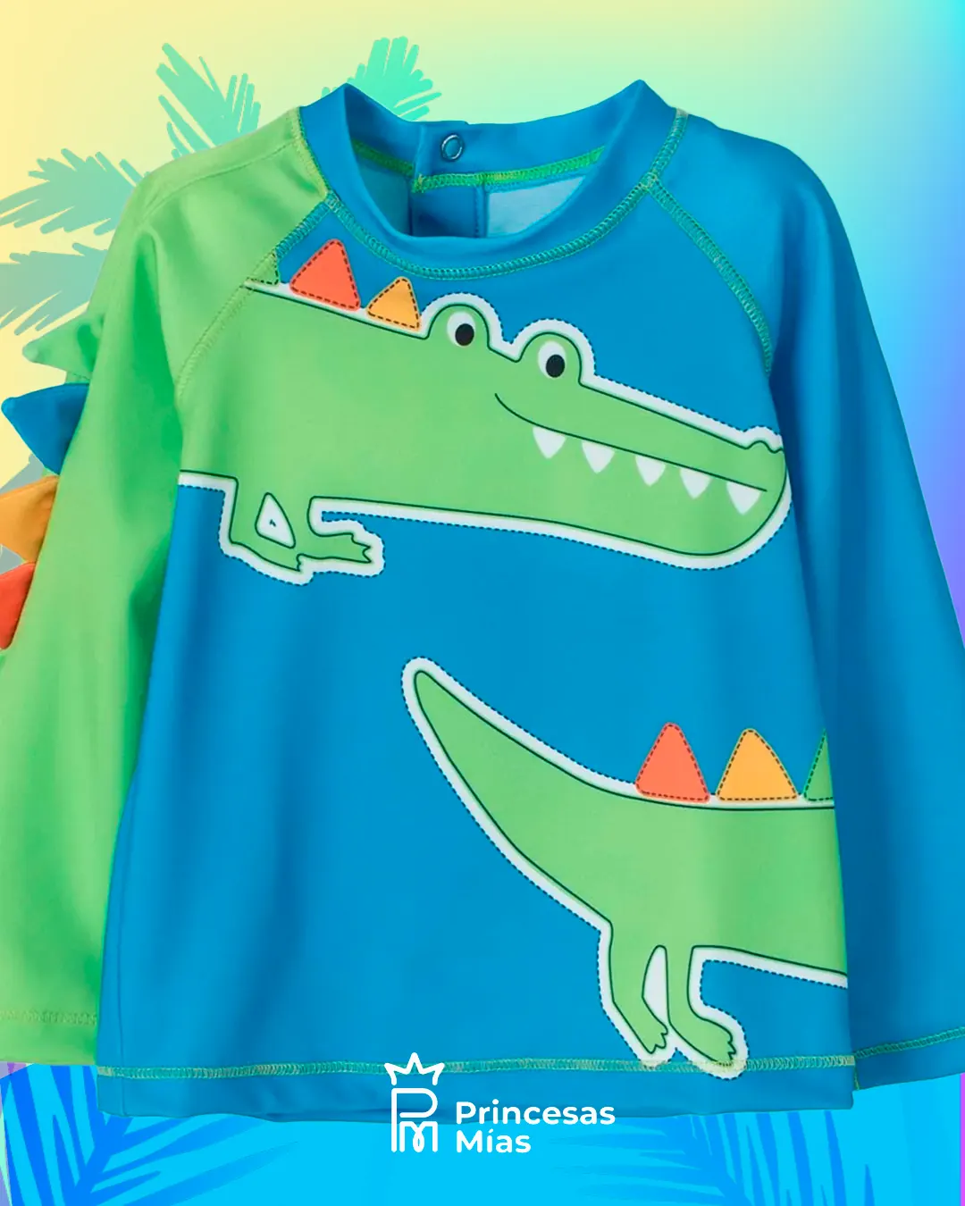 ¡Diversión al máximo este verano! Este conjunto de traje de baño con manguita larga es ideal para las tardes de pileta, río o playa. La remerita trae un cocodrilo gigante con crestas 3D en la manga y ayuda a cubrir mejor los bracitos del sol, mientras que el short de baño rayado multicolor es liviano y comodísimo para jugar sin parar. Tela con protección solar UV 50, pensada para los peques más traviesos y divertidos.