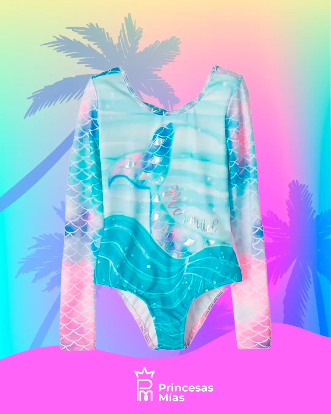 ¡Maravilloso y auténtico! Un vestido de baño sacado del océano. Cuenta con cuello redondo y manga larga para una comodidad de principio a fin. Tiras cruzadas en la espalda que la harán sentirse como toda una princesa libre y fabulosa. Estampado de colores y con detalles de brillantes que la harán verse tan perfecta como el mar.