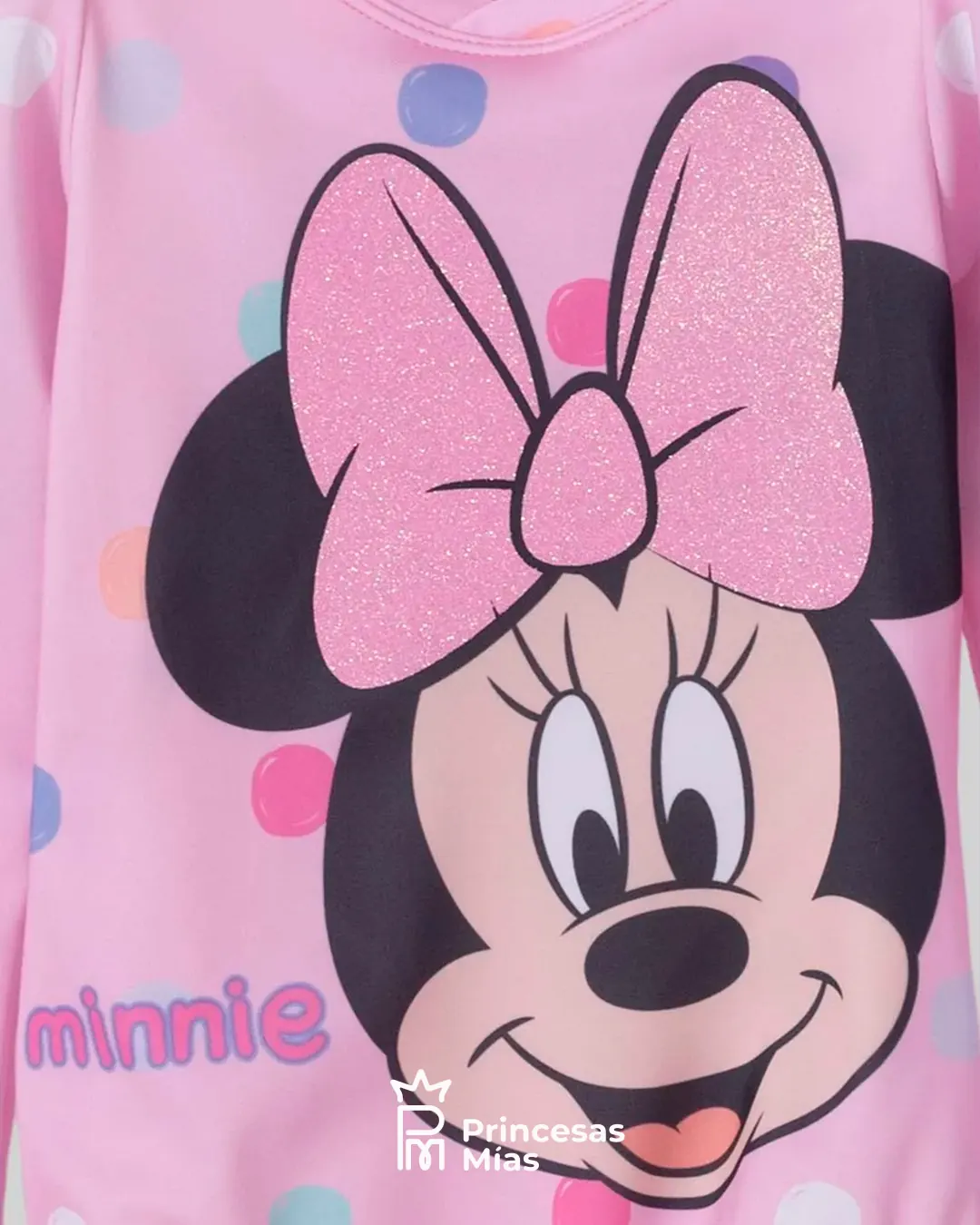 Días de sol, agua y mucha diversión con la ratoncita más adorable de la televisión. Este vestido de baño está diseñado para que tu pequeña juegue y brille como Minnie. Que empiece la diversión bajo el sol mientras disfruta de su manga larga con máxima protección que le darán ese aspecto tierno que tanto disfrutas en ella.Diseño: Vestido de baño entero de manga larga y cuello redondo con elongación, con ajuste de cierre en posterior y bolero en cintura. Cuenta con estampado en frente y estampado allover con apliques brillantes. 85% poliéster, 15% elastano, forro: 87% poliéster, 13% elastano
