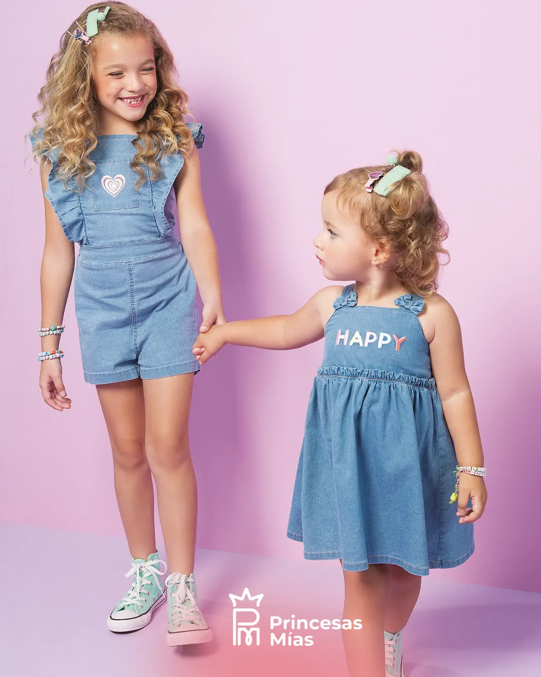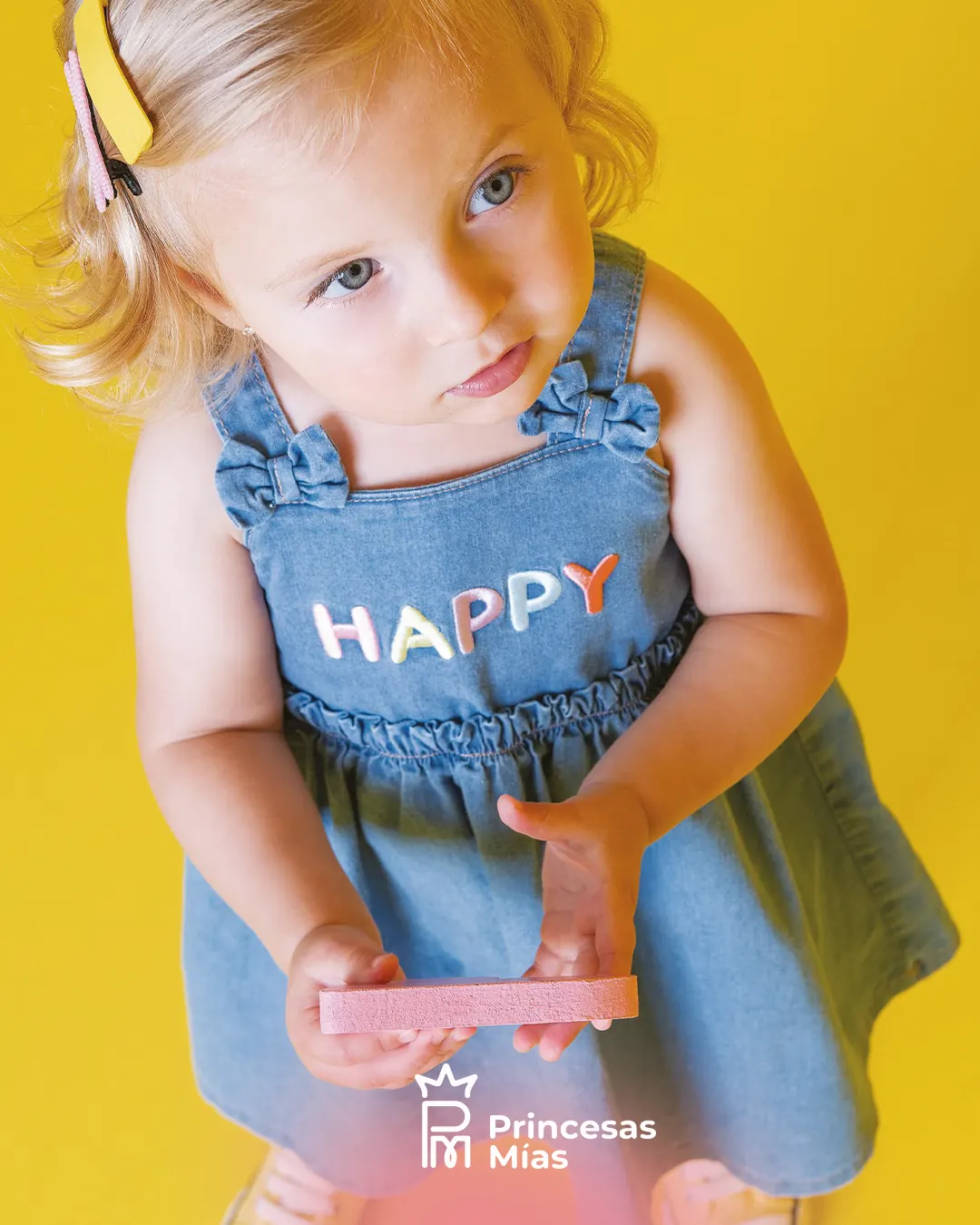 Vestido jeans Happy en denim liviano con elastano, pensado para acompañar cada momento de juego con mucha comodidad. El pecho trae la palabra HAPPY aplicada en colores pasteles, y los tirantes con nudos decorativos le dan un toque encantador. La falda amplia y con vuelo lo convierte en un aliado perfecto para los días de verano. Detalles del producto: Denim suave y liviano con elastano, más cómodo y flexible. Tirantes con nudos decorativos. Aplique frontal “HAPPY” en tonos multicolor. Falda con mucho movimiento, ideal para usar todos los días.